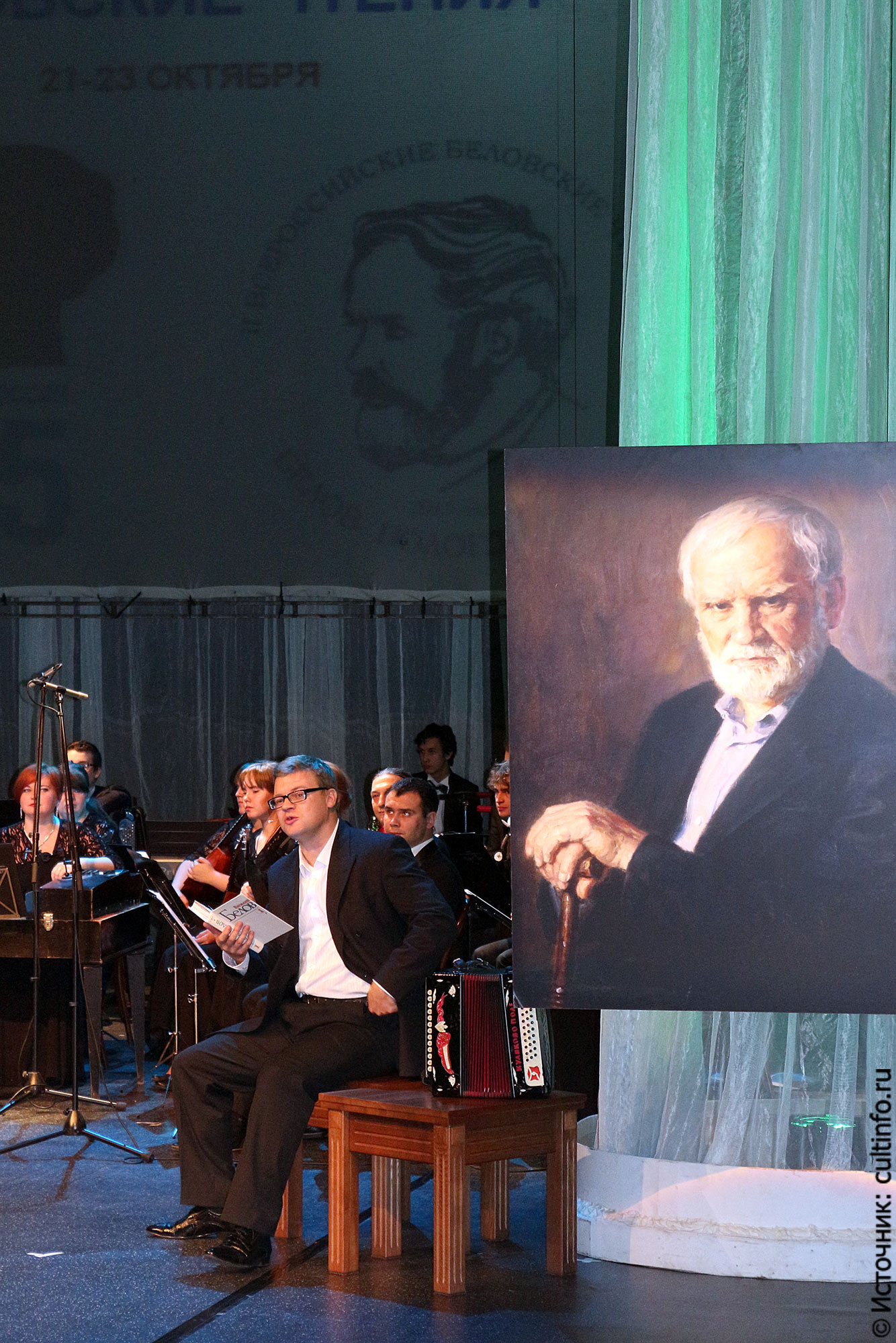 «От суеты и злобы дня / Спаси и впредь, спаси меня» – строки из беловской «Молитвы» первыми прозвучали со сцены, создав атмосферу духовности и умиротворения. Музыкальное сопровождение выступавшим артистам обеспечил оркестр русских народных инструментов «Перезвоны» (рук. А. Султаншин). Сочетание солирующей флейты с домрой, которые звучали параллельно с видеорядом незамысловатых пейзажей Русского Севера, олицетворяло спокойствие деревенской жизни.
