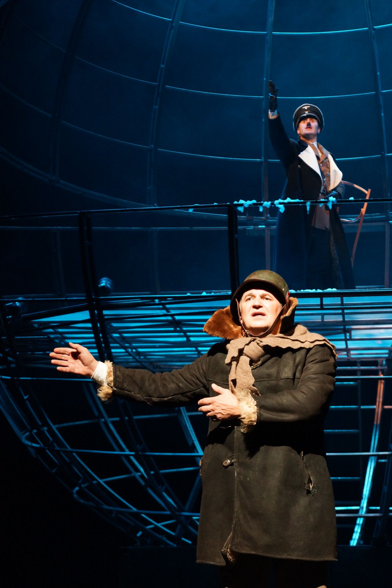Придавив зрителя волной страха, во втором акте авторы спектакля заходят с другой стороны, включая рычаги политической сатиры. В полузабытом жанре политического памфлета предстают похождения бравого солдата Швейка, каким-то чудом попавшего с Первой мировой на Вторую. Издевательское изображение фюрера, в окружении возбужденных генералов в женском обличье, дополняют фарсовость и абсурдность происходящего.