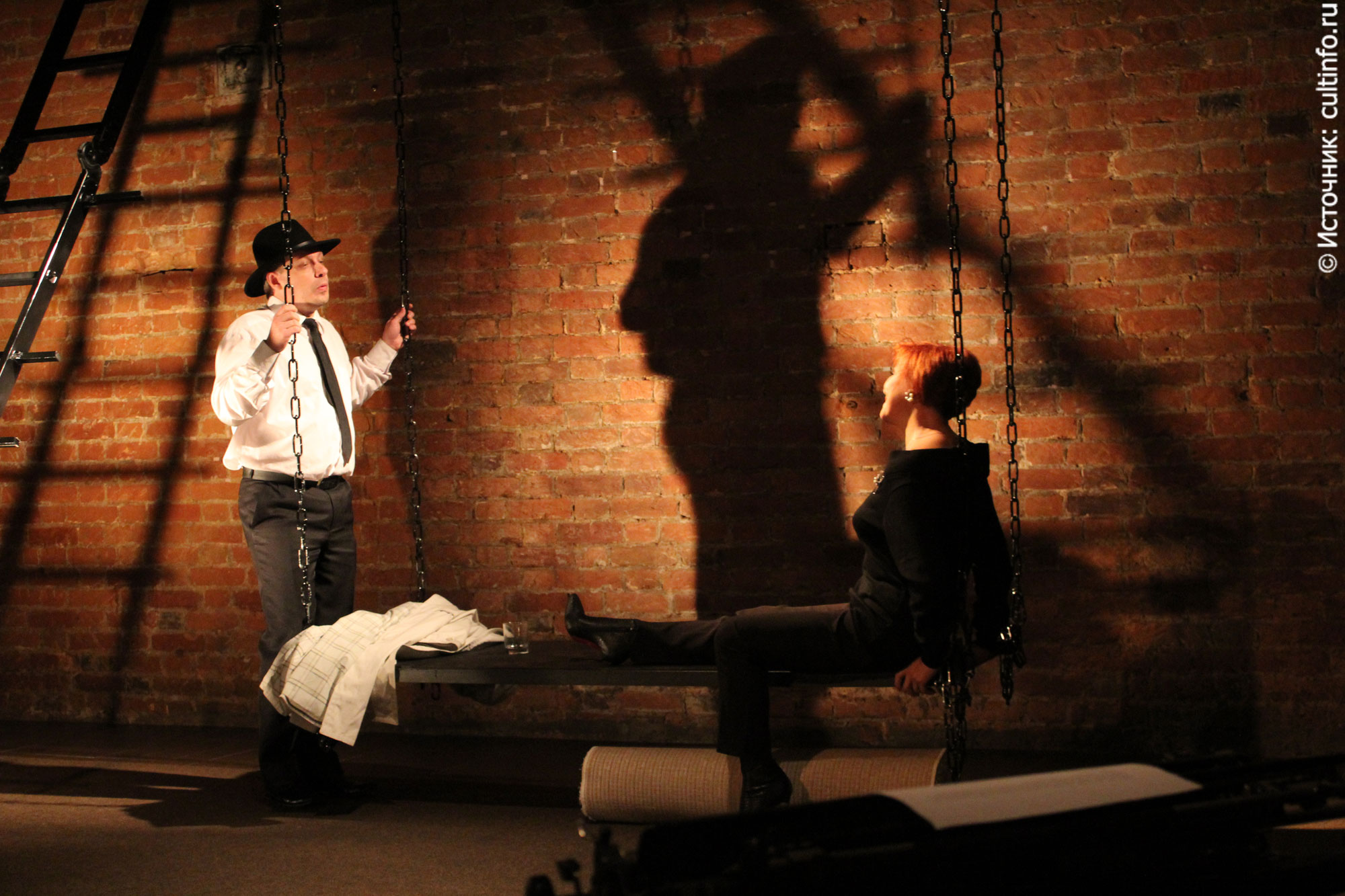 Пространство, в котором существуют герои, предельно функционально. Нужно было создать ощущение смутной тревоги, поэтому всячески подчеркивается странность обстановки, в которой происходит действие, и ее нестабильность. Этому служат и лестница, и качели, и собранный чемодан, и стопка книг, которые вот-вот упадут. Тени актеров на стене создают иллюзию присутствия кого-то третьего, высвеченные углы, затененные лица подчеркивают недосказанность. Все эти детали нужно было связать воедино общей стилистикой – и мы пошли в сторону хоррора, создав «место преступления» – пространства, где непременно что-то случится.