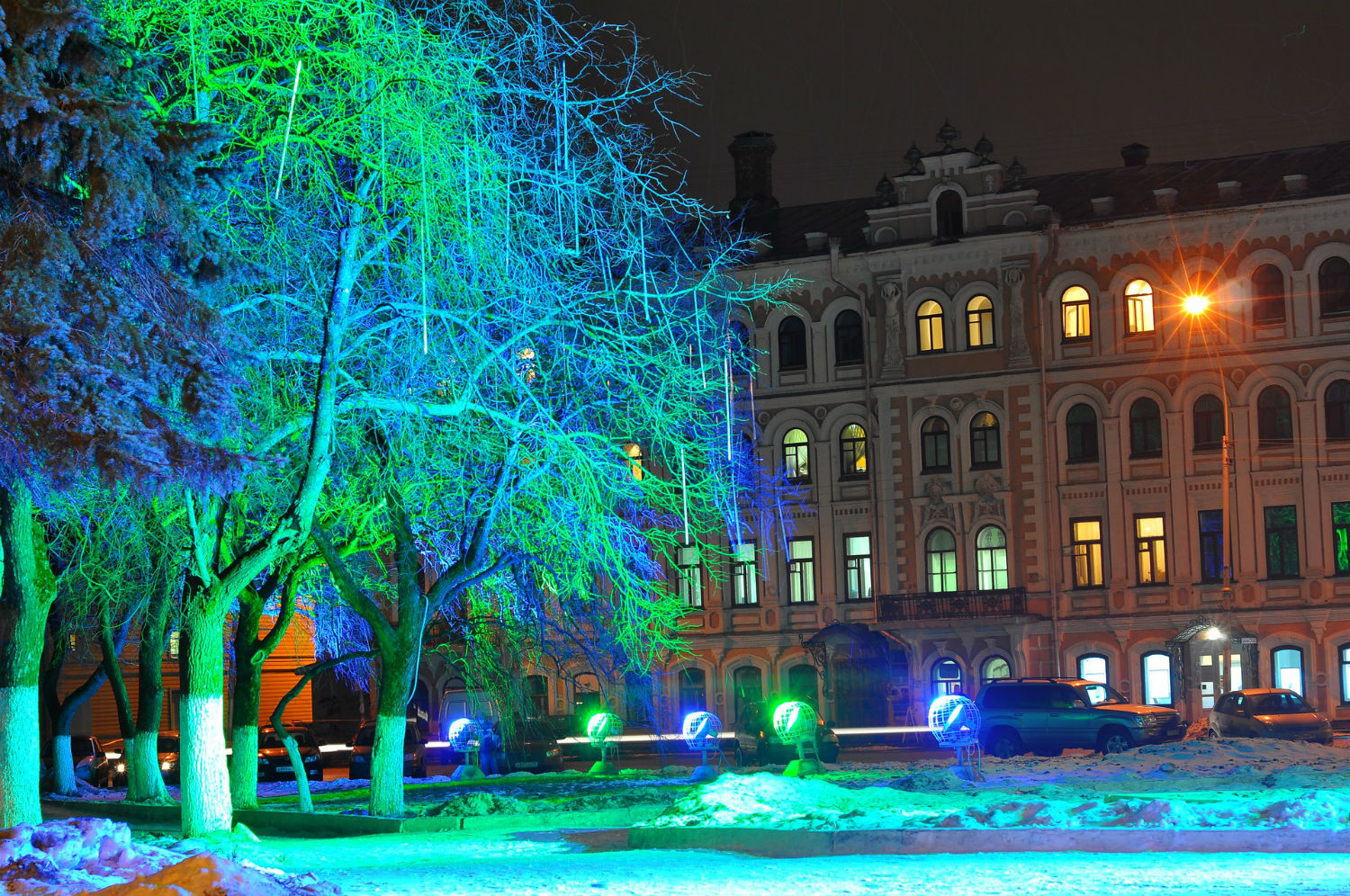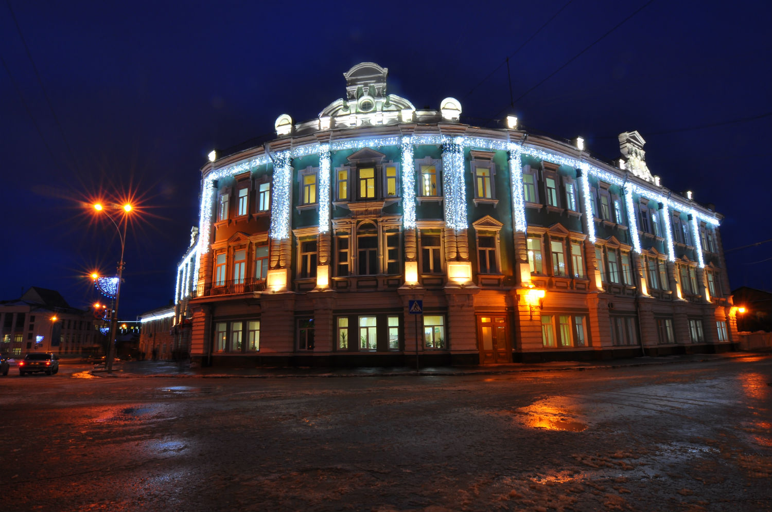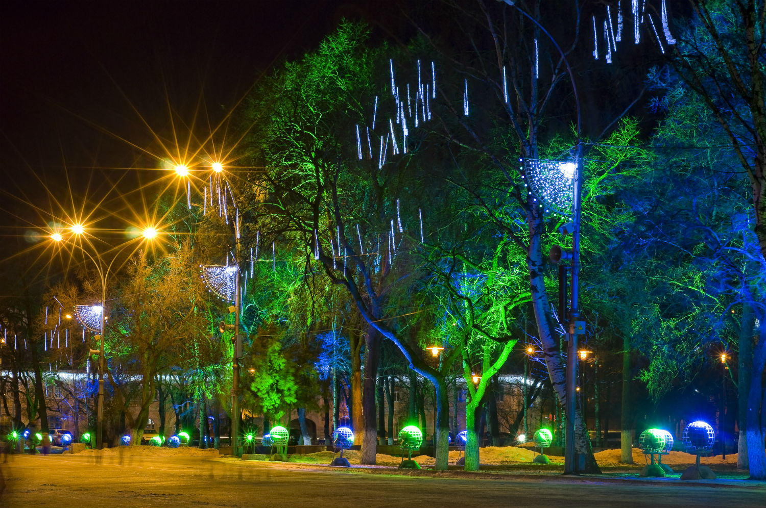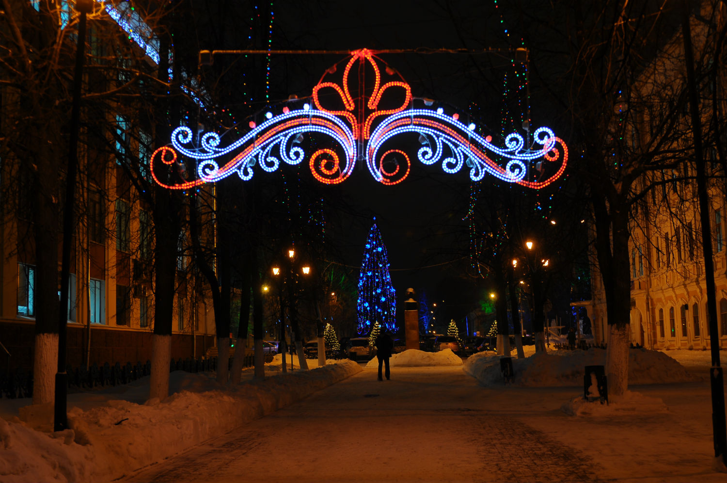 На площади Революции завершается монтаж гирлянды «тающие сосульки», после завершения этих работ специалисты приступят к расстановке цветных прожекторов. На фасадах административных зданий в центре города уже развесили световую бахрому.