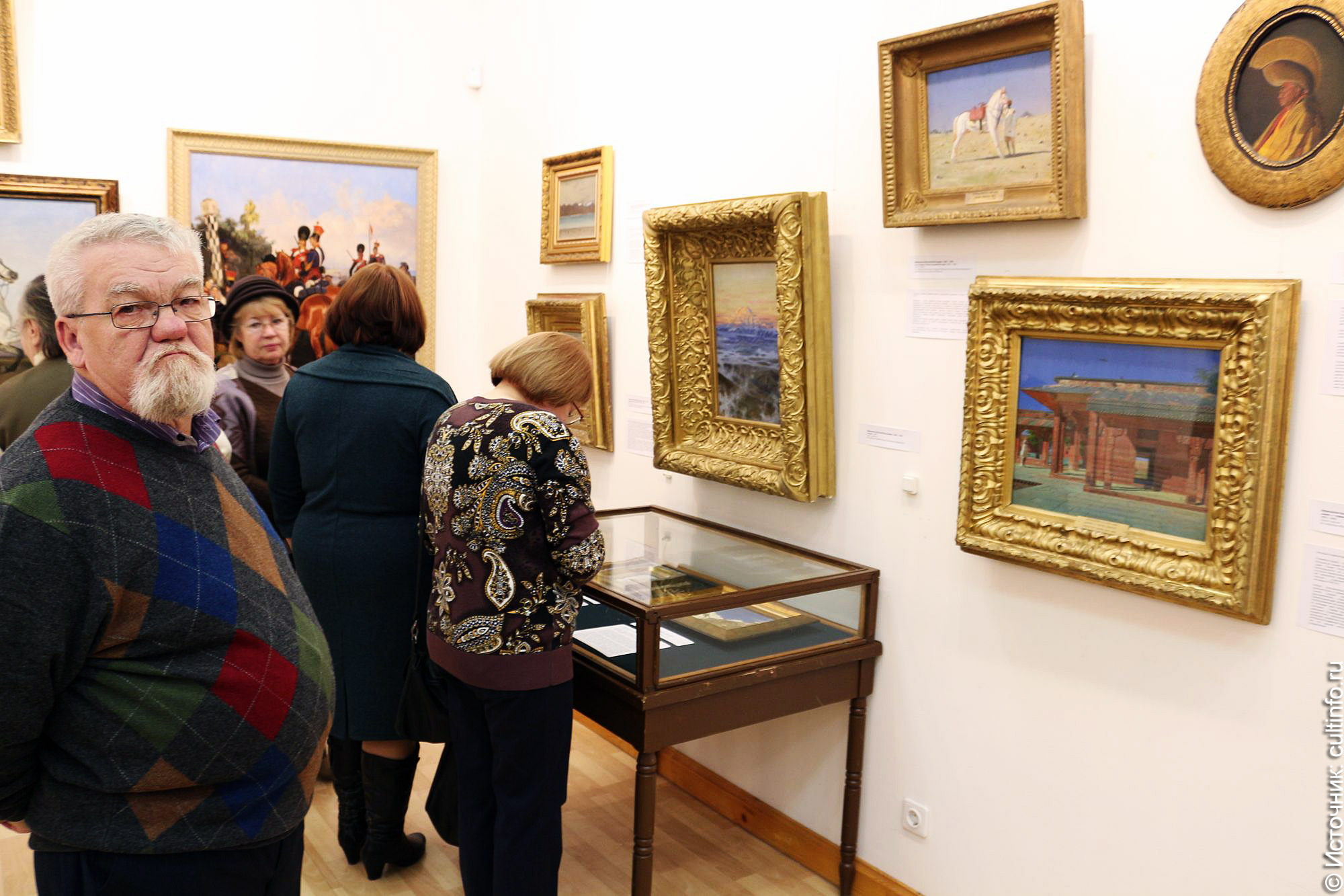В межмузейной экспозиции Верещагин больше предстает как пытливый исследователь, путешественник, вдумчиво изучающий культуру, природу, обычаи, традиции народов разных стран. Русский Север, Крым, Кавказ, Туркестан, Индия, Балканы, Палестина, США, Япония – почти вся жизнь художника прошла в поездках. На небольших холстах и деревянных досках он фиксировал все увиденное и интересующее его. Эти многочисленные этюды носят вполне законченный характер, отличаются композиционной целостностью, содержательностью, завершенностью художественной формы. На выставке рядом со спокойным вологодским пейзажем соседствует дворец кокандского хана, а рядом с видом Северной Двины – гордый Эльбрус.