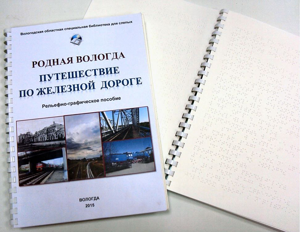 Рельефно-графическое пособие «Путешествие по железной дороге» выпущено спецбиблиотекой в рамках проекта «Родная Вологда». В издании рассказывается история строительства дороги Вологда – Ярославль, дана справка о работе станции «Вологда» в годы Великой Отечественной войны. Также в пособии размещена памятка для путешествующих на железнодорожном транспорте.
