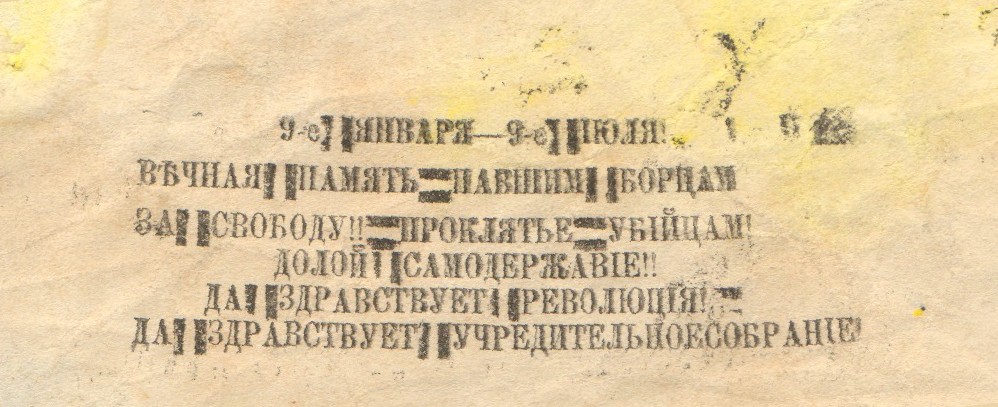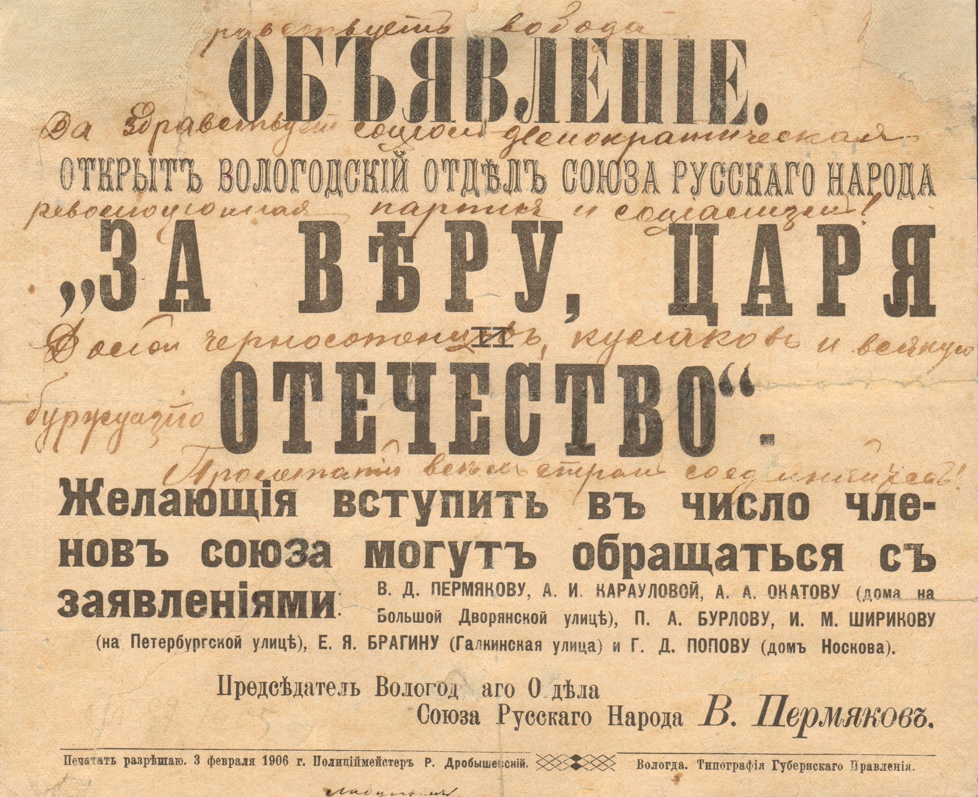 Представленные на выставке царские манифесты и карикатуры на власть, агитационные листки и сатирические народные песни, фотографии и газетные вырезки создают пусть и несколько мозаичное, но достаточно подробное впечатление о «брожении умов», подталкивающем революционные события. В экспозиции представлено несколько листовок с революционными воззваниями. Одна из них, с короткими призывными фразами «Вечная память павшим борцам за свободу! Проклятье убийцам! Долой самодержавие! Да здравствует революция! Да здравствует учредительное собрание!», отпечатанная в подпольной типографии, была сброшена с галерки на спектакле в городском театре в июле 1905 года, по воспоминаниям очевидцев, прямо на голову вологодскому губернатору. Прочувствовать напряженность, царившую в политической среде в начале прошлого века, можно, даже бегло просмотрев печатное объявление о создании Вологодского отделения «Союза Русского народа», – поверх печатного текста в качестве наглядного доказательства борьбы идеологий читается рукописная контрагитация РСДРП.