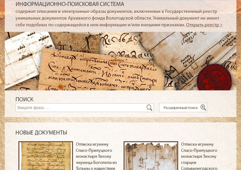В сеть выложены архивные документы, отнесенные к категории уникальных документов Вологодской области, то есть не имеющие себе подобных в регионе по содержащейся в них информации или их внешним признакам. Информационная система позволяет в удаленном доступе работать с цифровыми образами архивных документов.