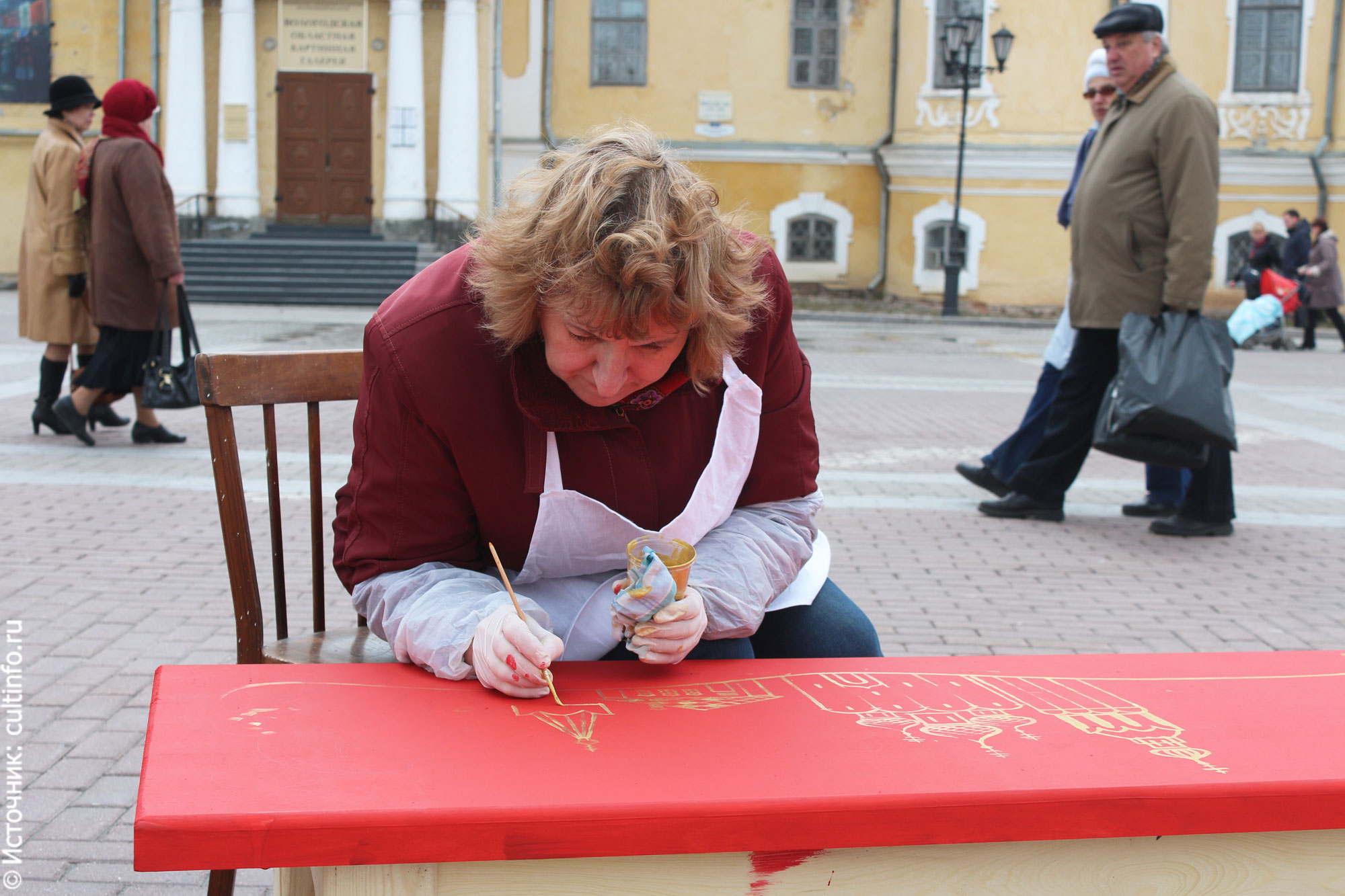 Лавки, расставленные по периметру припаркованных уазиков, раскрашивали учащиеся и преподаватели Губернаторского колледжа народных промыслов. На деревянных сидениях появлялись узоры вологодских росписей, пейзажи с известными видами Вологды, стены Софии и золотой купол колокольни Вологодского кремля. Одна из лавок станет украшением выставочного комплекса на ВДНХ.
