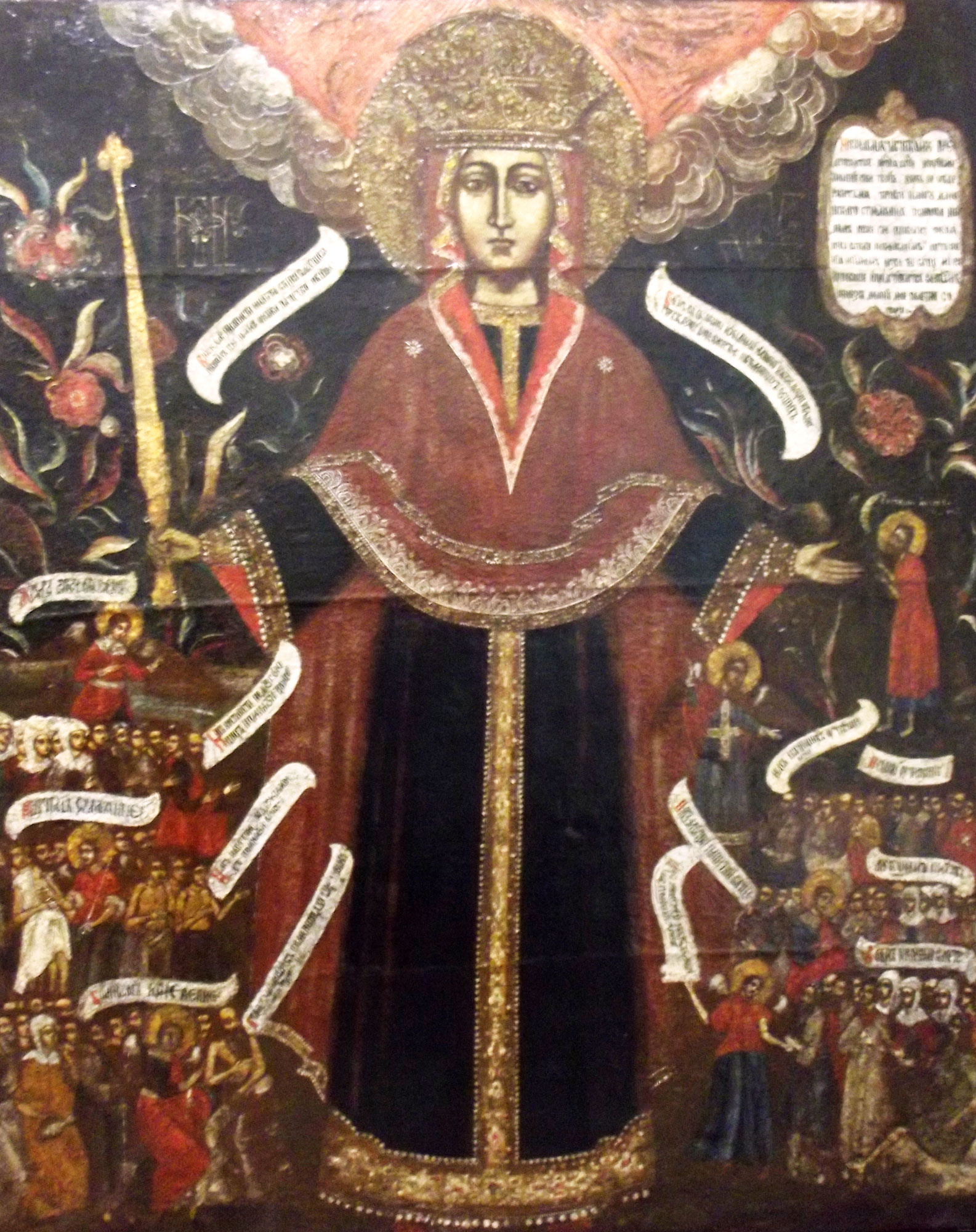 Однако исследования краеведа Д.А.Григорова, выполненные в начале ХХ века, и иные документальные источники из фондов нашего музея давали понять, что от поляков Тотьму защитила Богоматерь Смоленская, тогда как на данной иконе иной образ Богоматери – «Всех скорбящих Радость». А исследования московских реставраторов показали, что перед нами произведение искусства, созданное не ранее середины семнадцатого века. Тем не менее даже это время создания дает возможность предполагать, что какое-то время икона всё же могла находиться над воротами тотемской крепости, разобранной лишь в восемнадцатом столетии.