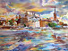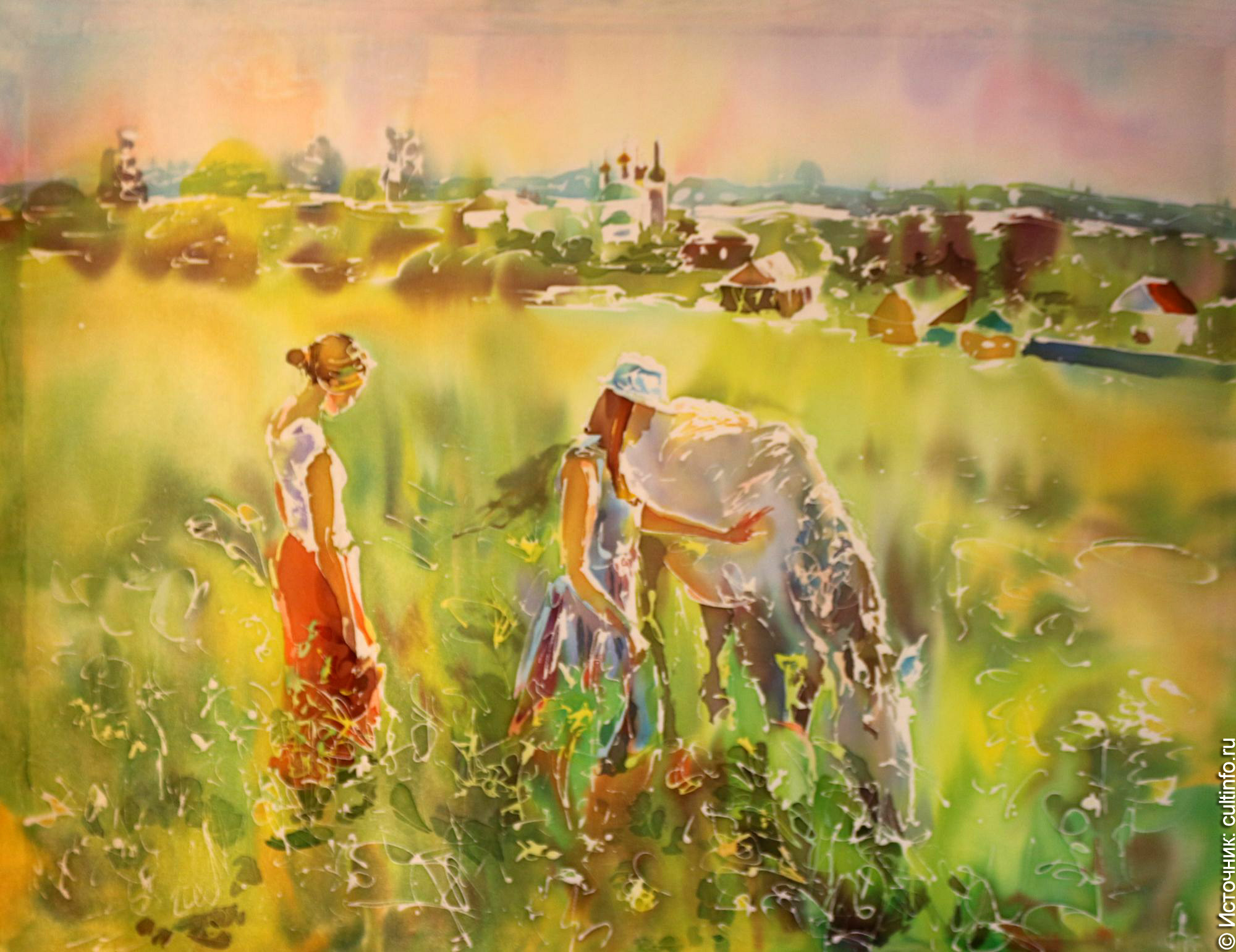 Техника батика – ручной росписи по ткани с использованием резервирующего состава (специального закрепителя), в которой работает Татьяна Шмелева, – издавна известна на Востоке: в Индонезии, Китае, Индии. В Европу она пришла сравнительно недавно, в ХХ веке. Батик позволяет передать ощущение неуловимой изменчивости, легкости воздушной и водной среды, поэтому на выставке так много пейзажей, «наполненных» небом и водой: остров Валаам, Николо-Бабаевский монастырь под Костромой, где прошли последние годы святителя Игнатия Брянчанинова («Тишина»), озеро Селигер и город Осташков в Тверской области, сказочный Стокгольм и, конечно, родные вологодские просторы. Некоторых мест, запечатленных на картинах художницы, уже не существует: деревянный домик на улице Предтеченской («Не забытое старое») – это теперь только воспоминание.