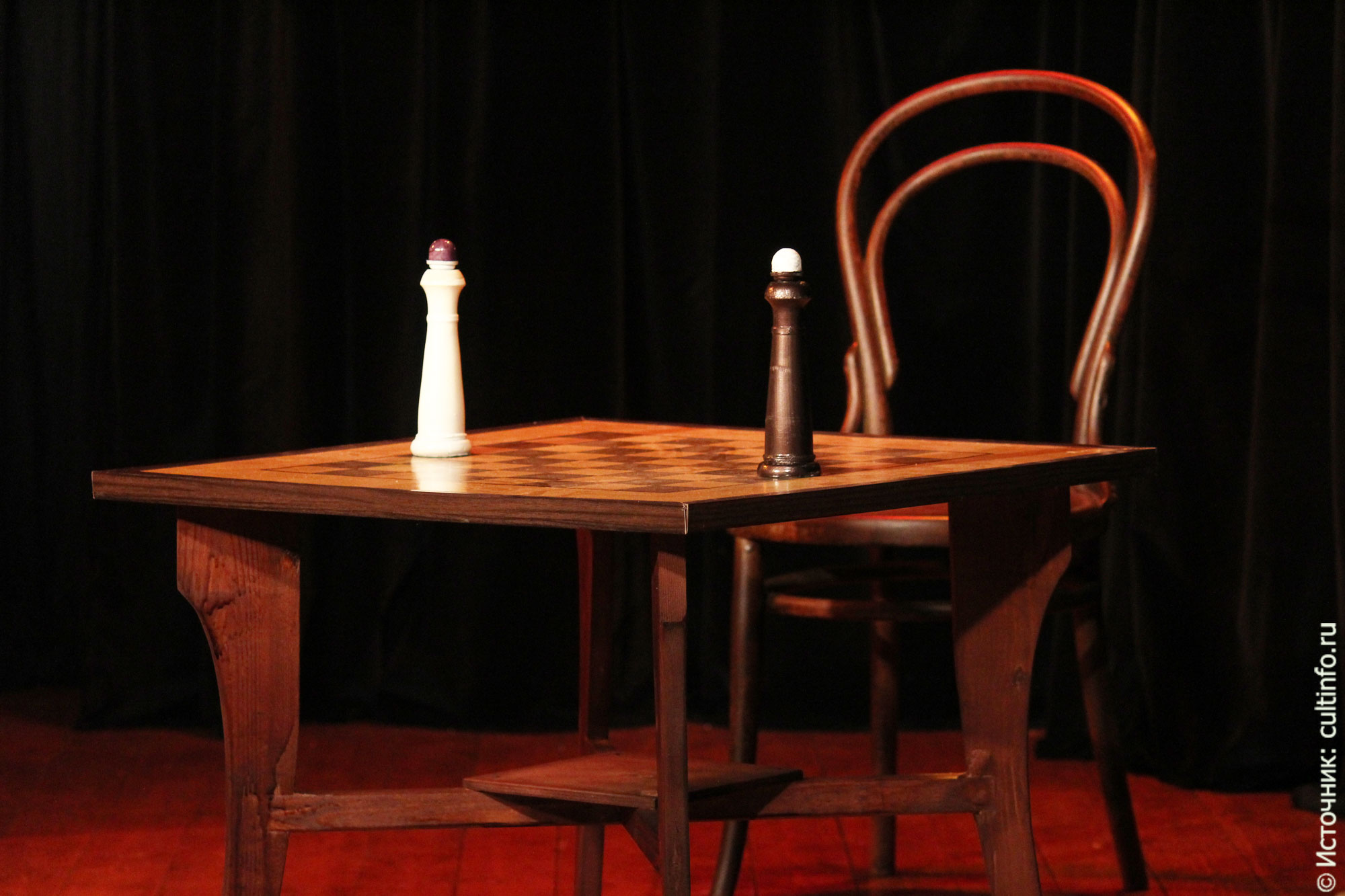 Лаконичная сценография спектакля – связанные стопкой книжные фолианты, грифельная доска, два дуэльных пистолета и стол-шахматная доска с двумя фигурами – позволяет вместить на сцену все эпохи – и век XIX, и 1970-е, и 1990-е, и наше время. Камерная сцена, где актер один на один со зрителем, располагает к откровенному разговору, практически к исповеди – и важно не сфальшивить и не пережать, донести и кураж, и настроение, и, самое главное, – мысль. Молодому актеру Вологодского драматического театра Михаилу Морозову это удается в полной мере. Используя различные краски, оттенки интонации, богатую мимику и жестикуляцию, перевоплощаясь в многочисленных героев своего повествования, он ведет зрителя к развязке своей истории.