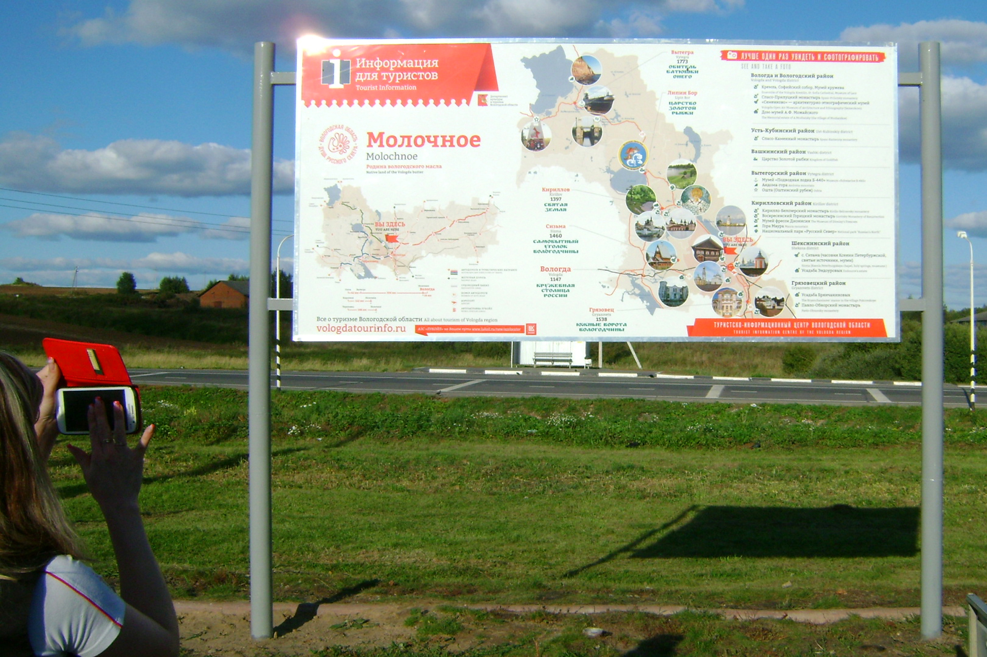 Информация для гостей региона уже появилась в Вологодском, Вытегорском и Череповецком районах. Стенды помогут путешествующим узнать о главных туристических направлениях региона, расположение основных достопримечательностей, расстоянии до объектов. Всего в 2015 году запланировано установить шесть подобных модулей на основных магистралях Вологодской области. В ближайшее время инфостенды появятся на территориях объектов придорожного сервиса Чагодощенского, Кадуйского и Нюксенского районах.