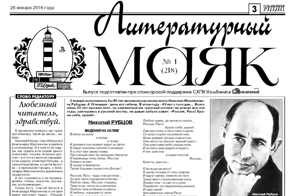 «Литературный маяк» – приложение к газете Вологодского района «Маяк», давно известной своими литературными традициями. На ее страницах публиковались известные вологодские авторы, среди них Николай Рубцов, Сергей Чухин, Нина Груздева и многие другие. В 90-х годах прошлого века по инициативе известного вологодского писателя и журналиста Юрия Леднева издавалось приложение к «Маяку» – газета «Вологжане улыбаются», в которой печатались произведения местных авторов и представителей других регионов.