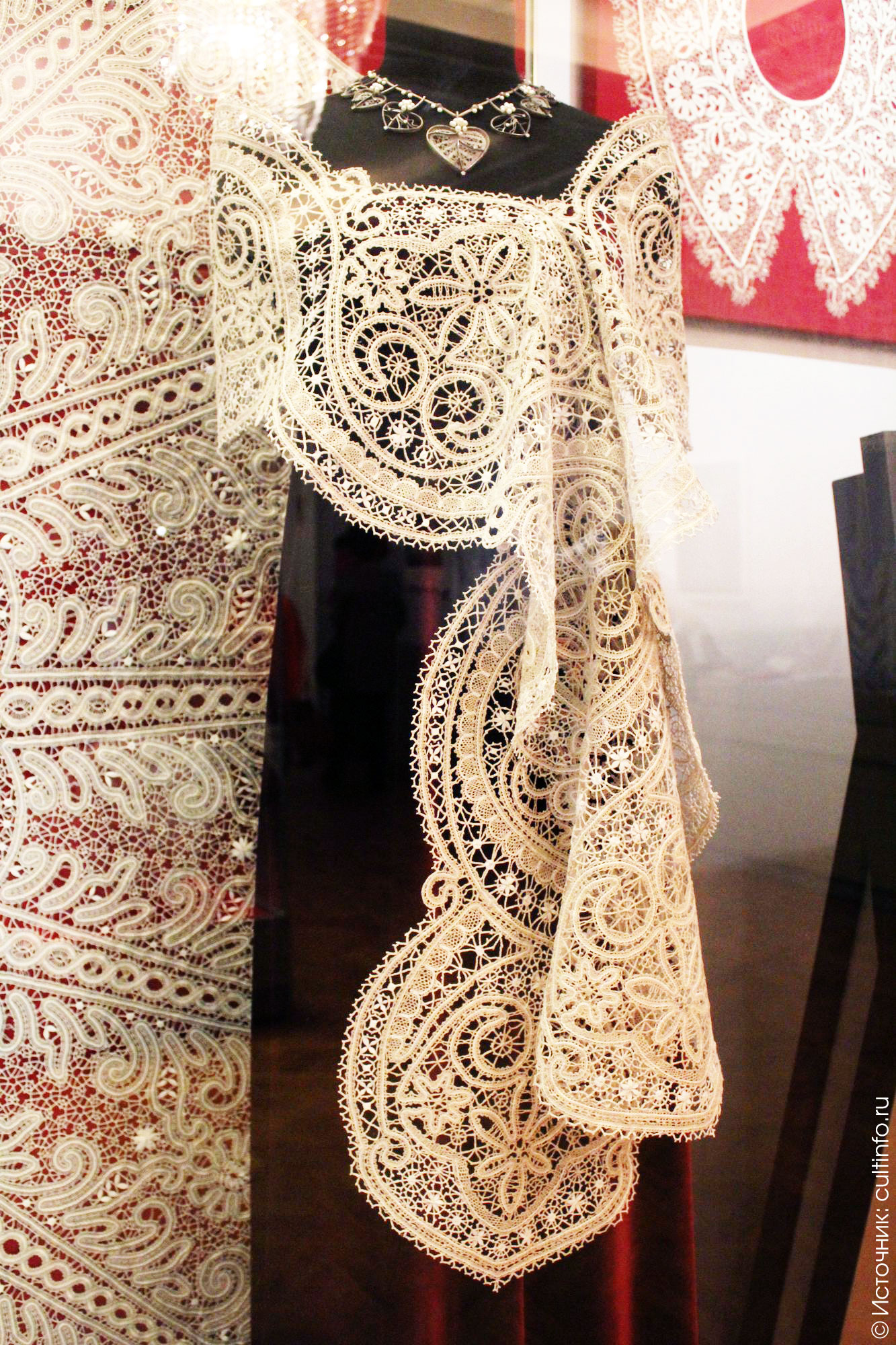 Издавна кружевом украшали костюмы, оно считалось признаком роскоши. В основном на выставке представлена женская одежда и аксессуары: платья, сорочки, зонтики, накидки, чепчики, воротники, веера. Они созданы в разных традициях вологодского, киришского, елецкого, михайловского кружева.