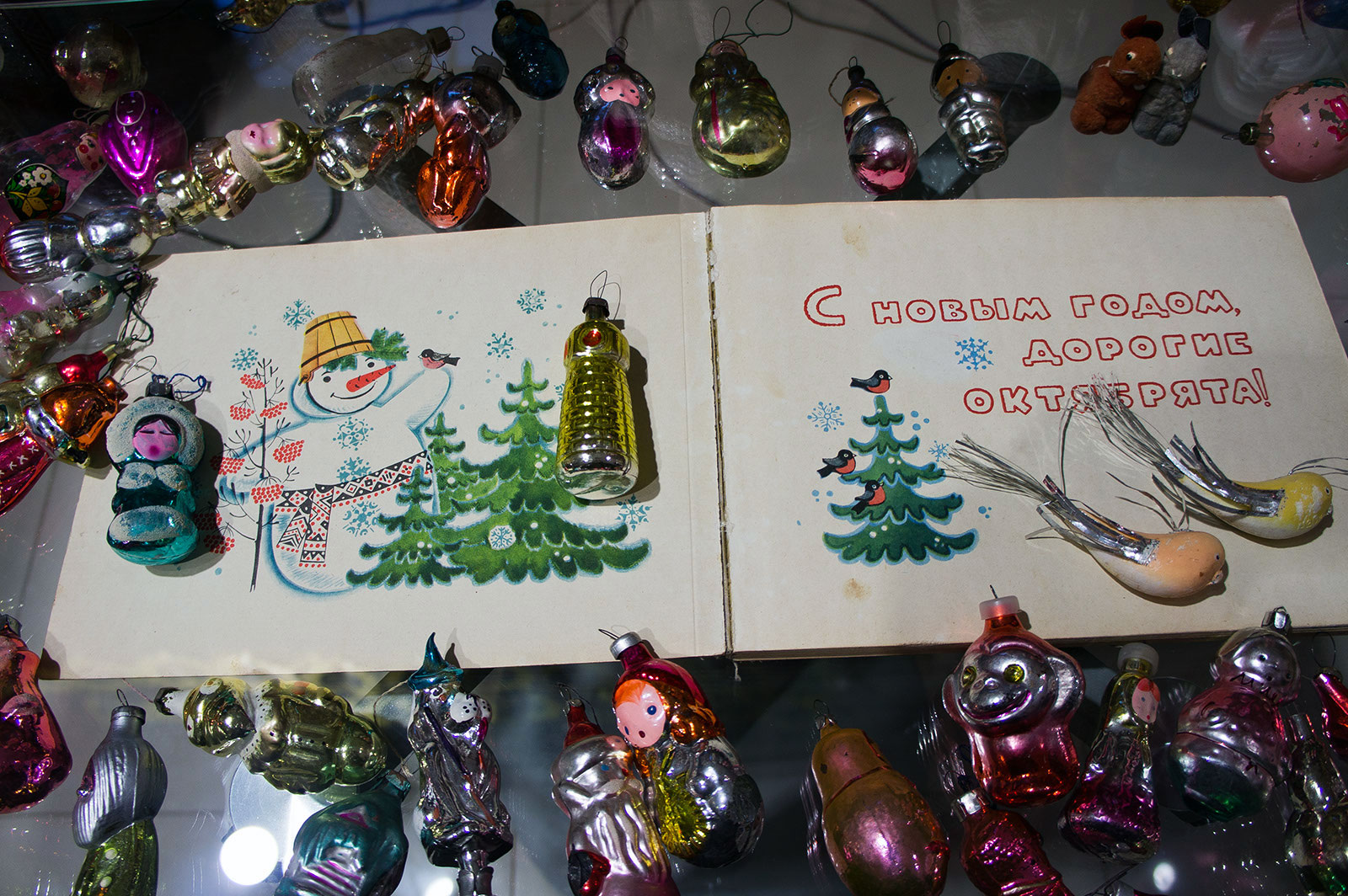 В экспозиции представлено более 200 предметов, среди которых старые открытки, стеклянные елочные игрушки, коньки и лыжи времен Советского Союза.