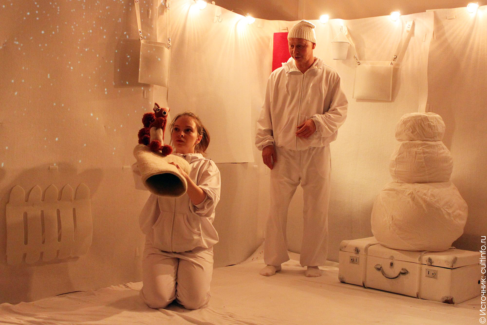 В зале нет четких границ между сценой и зрителем. Любую декорацию участники спектакля могут потрогать и поиграть с ней. Во время постановки дети рисуют морозные узоры в волшебных чемоданах, лепят снеговиков, кидаются снежками и даже становятся ведущими на местном телевидении.
