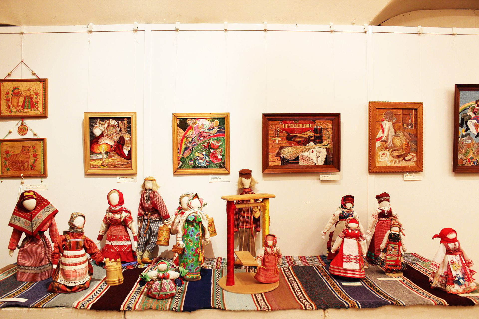Это изделия из бересты, декорированные в технике шемогодской резьбы, роспись по дереву, народный костюм, вологодское кружево, вышивка, лоскутное шитьё, гобелены, народная кукла и многое другое.