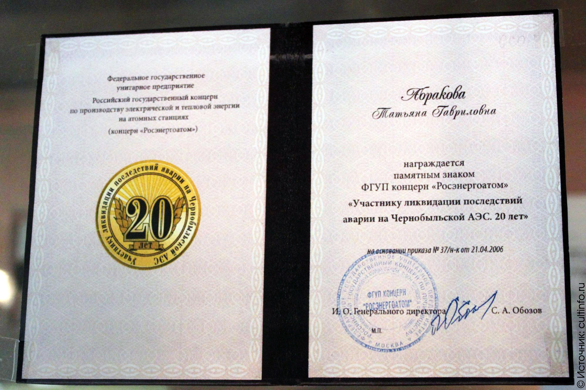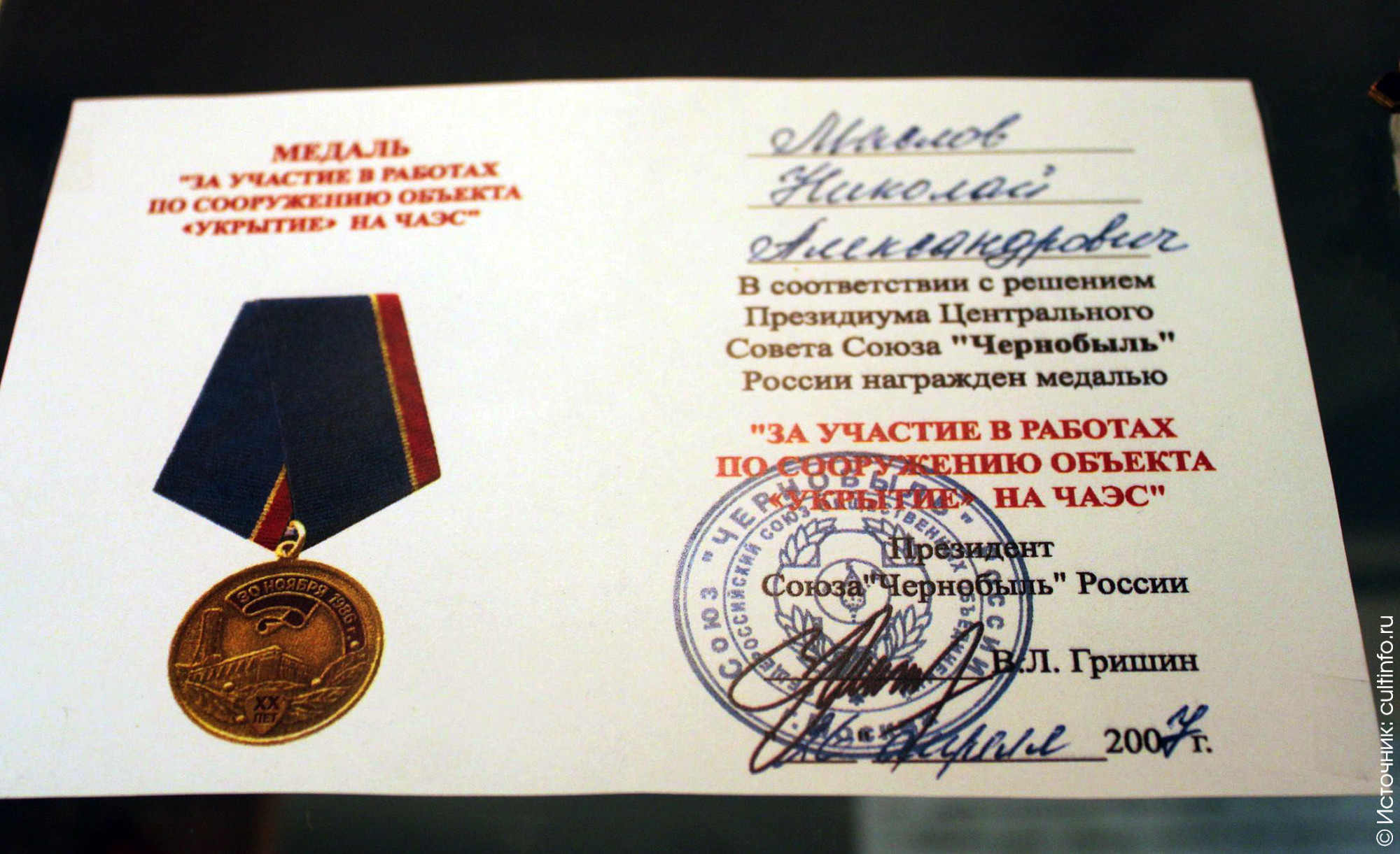 Часть медалей, благодарностей, грамот за самоотверженный труд можно увидеть на выставке в архиве. Это награды Николая Стариченкова, Татьяны Абраковой, Николая Маслова и других. Также показаны письма ликвидаторов из Чернобыля своим семьям. «Здравствуйте, мои дорогие Манюсик и сынулька. Я уже семь раз ездил на эту ненавистную станцию и получил восемь рентген, а надо получить двадцать, чтобы уехать домой <...> Сейчас езжу каждый день на АЭС, и числа 15 ноября наберу свою дозу, буду ждать замены и вернусь к вам. Я бы все отдал, чтобы на часок повидаться с вами», – писал жене и сыну Александр Еремин.