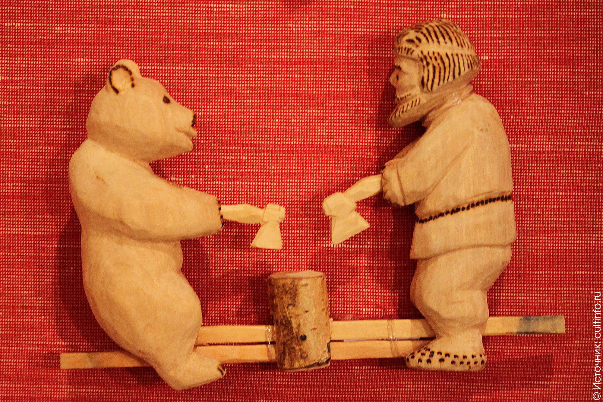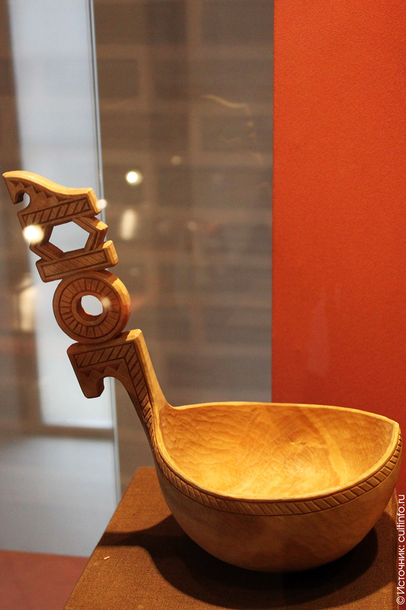 Значительную часть экспозиции составляют изделия из дерева. Это традиционные игрушки: коники-каталки, качалки, коники с саночками и тележками, деревянные куклы-панки. Их дополняют пряничные доски, традиционная деревянная посуда, а также декоративные тарелки, доски, короба и шкатулки с вологодскими росписями. На выставке, например, можно увидеть ковш-скопкарь с фигурной рукояткой. В нем к праздничному столу было принято выносить вино, квас или мед.