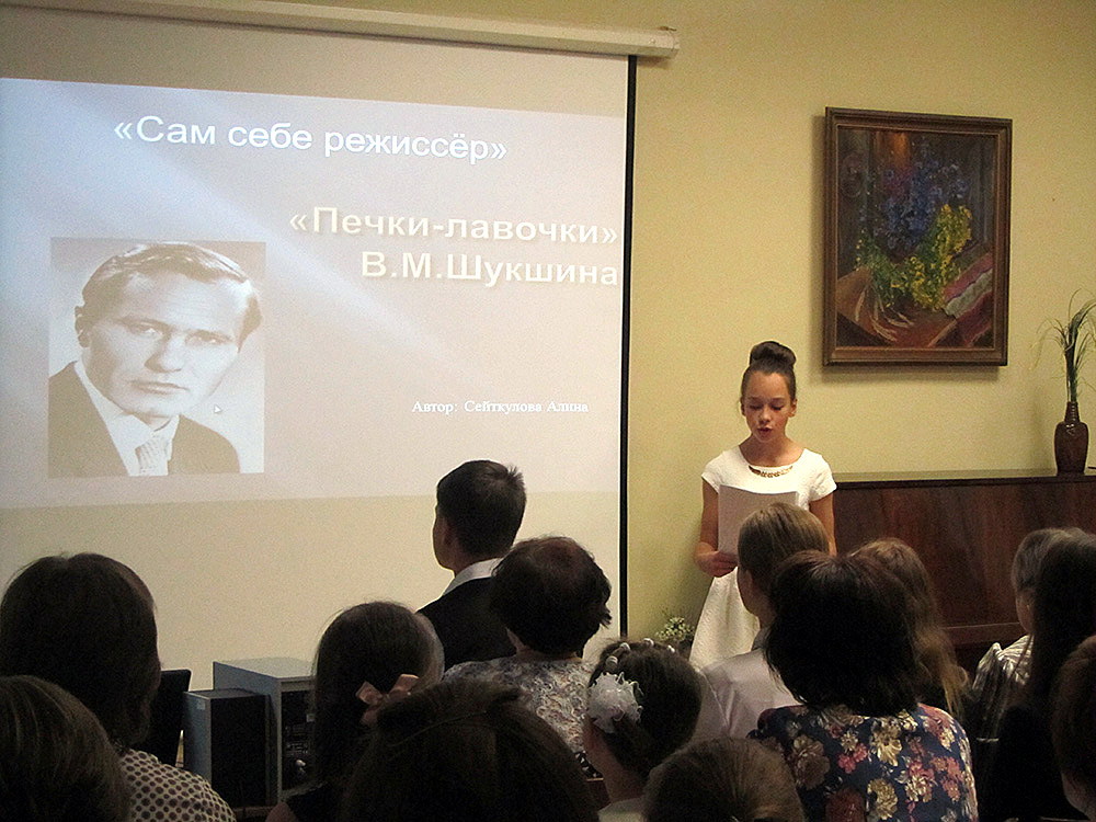 Участники номинации «Сам себе режиссер» рассказали о выдающихся писателях России, которые не только написали сценарий для постановки фильма по своему произведению, но и сыграли в нем одну из ролей. Ребята выбрали Василия Шукшина и Алексея Баталова. Победителем номинации стал Андрей Покровский, г. Вологда, второе место заняла Алина Сейткулова, г. Харовск.