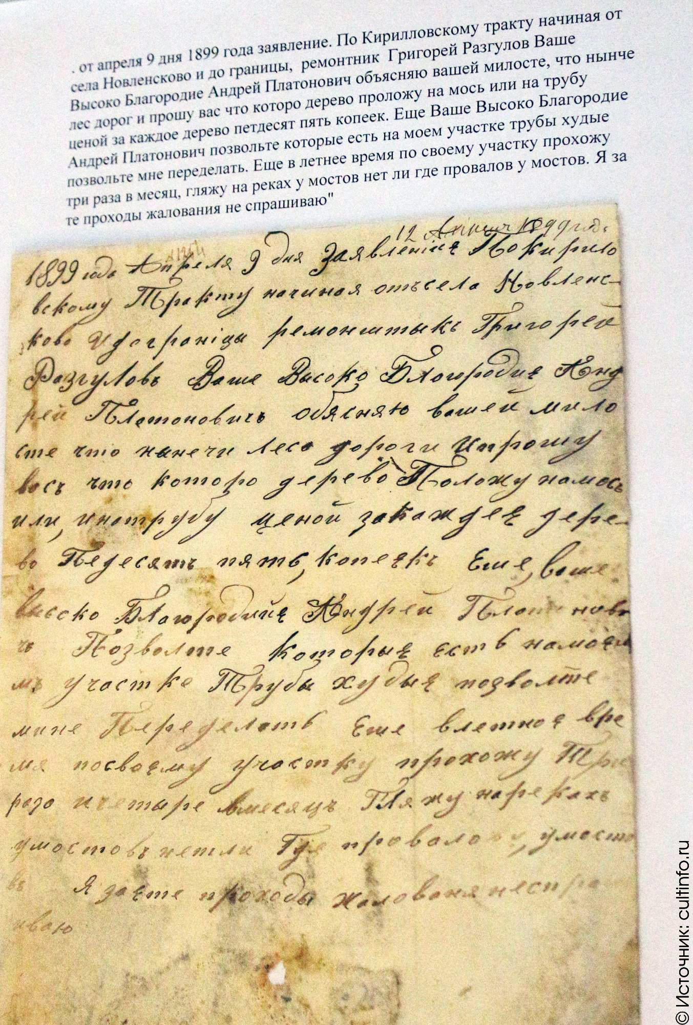 «По Кирилловскому тракту, начиная от села Новленского и до границы, ремонтник Григорей Разгулов. Ваше высокоблагородие Андрей Павлович, объясняю вашей милости, что нынче лес дорог и прошу вас, что которое дерево проложу на мось или на трубу, ценой за каждое дерево пятьдесят пять копеек. Еще, ваше высокоблагородие Андрей Павлович, позвольте мне переделать трубы худые, которые есть на моем участке. Еще в летнее время по своему участку прохожу три раза в месяц, гляжу, на реках у мостов нет ли где провалов. Я за те проходы жалования не спрашиваю», – говорится в заявлении от 9 апреля 1899 года.