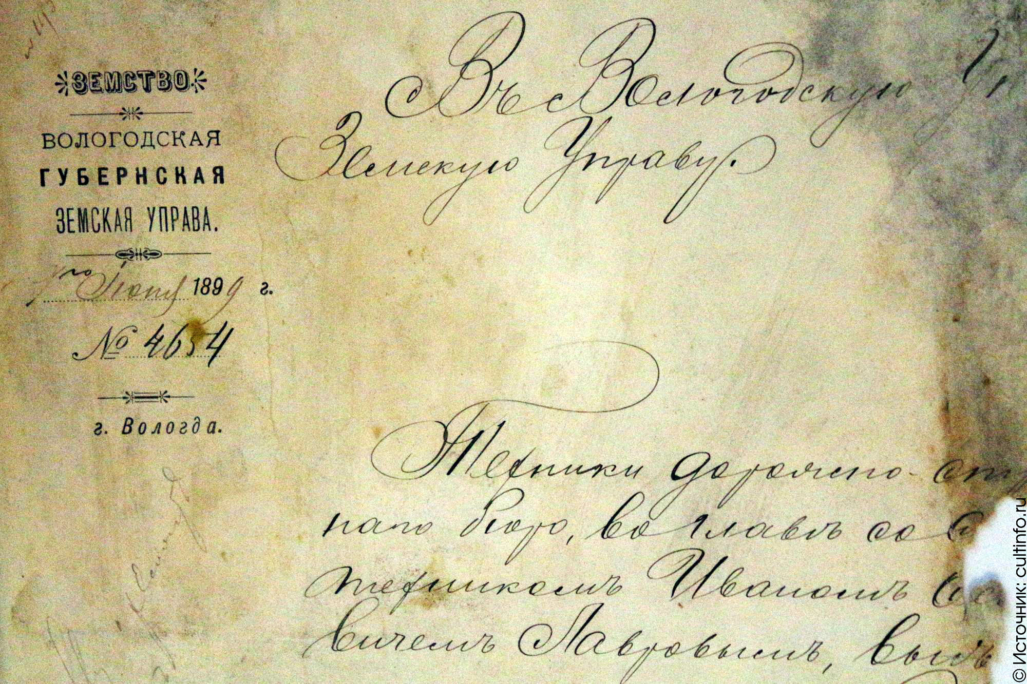 Также удалось восстановить и докладные записки, которые поступили в 1899 году в Земскую управу. В одной из них говорится о замечаниях, выявленных во время осмотра перегона Вологда – Оларево: «1. Сделать подвалку к местам подъезда, чтобы въезд на них был ровным и более пологим. 2. Большие выбоины заделать хворостом, более основательные места выбоин проезда я не решался, так как стоило больших денег. При сем присовокуплении по сказанному тракту вид неудовлетворительный, а материалов для его подновления нет, обращаю особое внимание по оному в будущем…».