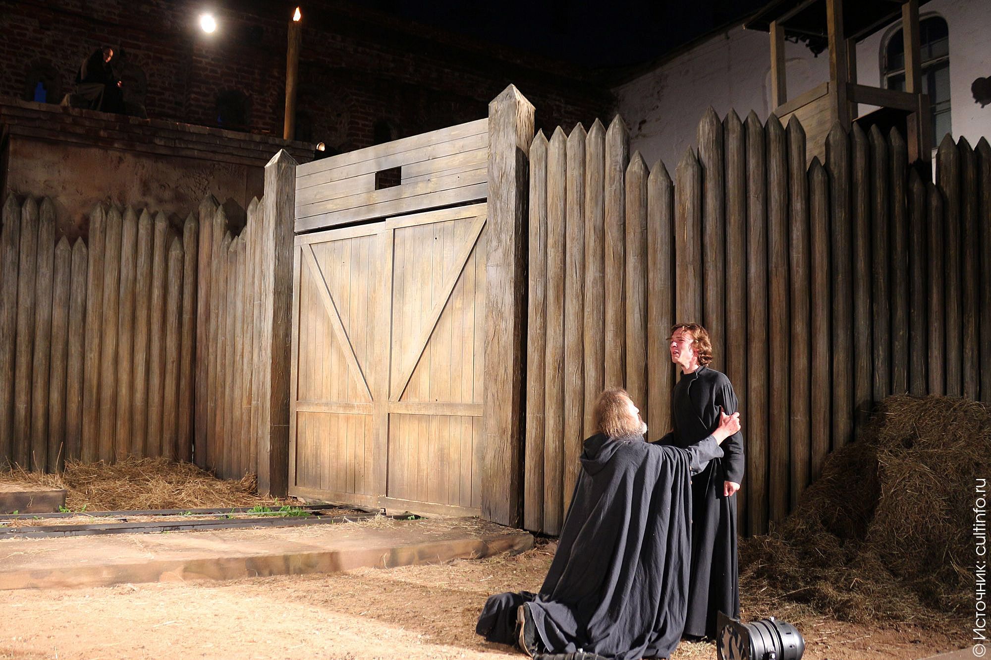 Для XIII театрального фестиваля «Голоса истории» Вологодский драмтеатр выбрал непростой для постановки материал. «Святая обитель» в постановке Зураба Нанобашвили – спектакль долгожданный и неожиданный одновременно. Те, кто шел в Консисторский дворик Кремля, ожидая увидеть некое абстрактное действо с обилием цитат из Священного Писания и долгими духовными беседами, обманулись в своих ожиданиях: в спектакле, созданном труппой театра специально к «Голосам истории», присутствовала вполне определенная сюжетная линия, цепь эпизодов, связанных образом инока, основывающего вполне «осязаемую» (если брать внешнюю сторону) святую обитель. И несмотря на конкретность действия вся атмосфера спектакля ни на секунду не давала забыть, что перед нами – метафора пути духовных и жизненных исканий, к которой каждый волен относиться по-своему.