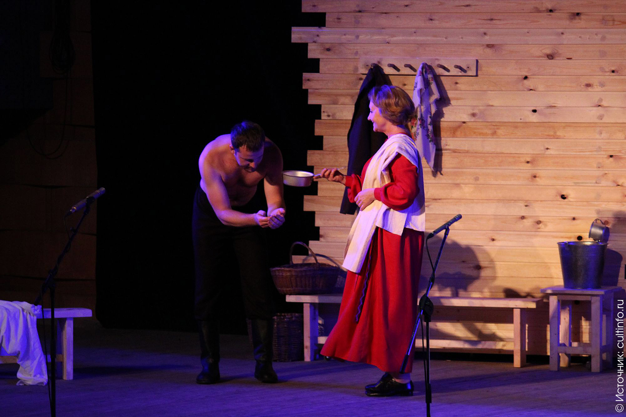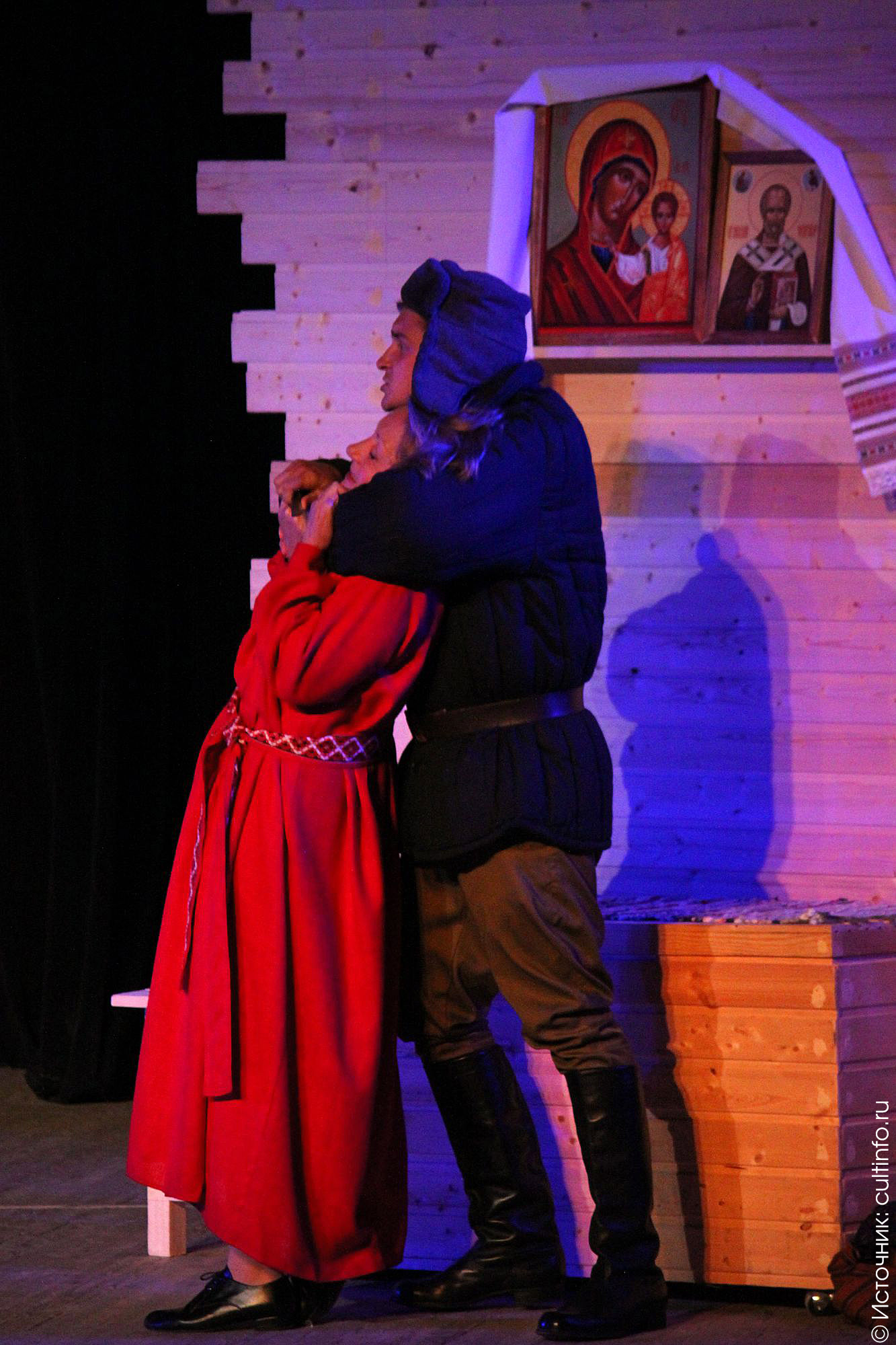 Простой сюжет наполнен в спектакле глубоким смыслом. Образ главной героини Екатерины, созданный заслуженной артисткой России Еленой Полянской, воплощает в себе судьбы всех русских женщин. Молодая, трудолюбивая, стараясь улыбаться даже «с камнем на сердце», она помогла мужу пройти всю войну и вернуться домой. Героиня – источник любви и красоты, а ее красное платье – символ веры и мужества. Не случайно в эпизоде после родов Володи эту простую крестьянку хочется сравнить с Девой Марией, сошедшей с полотен великих художников эпохи Ренессанса. Екатерина часто крестится перед иконой Божией Матери, просит ее о чем-то или благодарит – она чувствует, что пока есть вера в ее сердце, будет жить ее Николай.