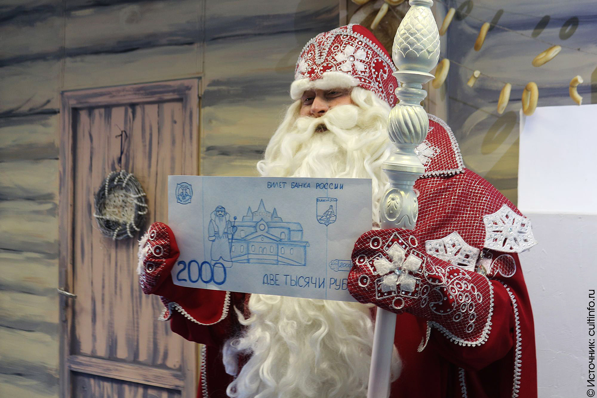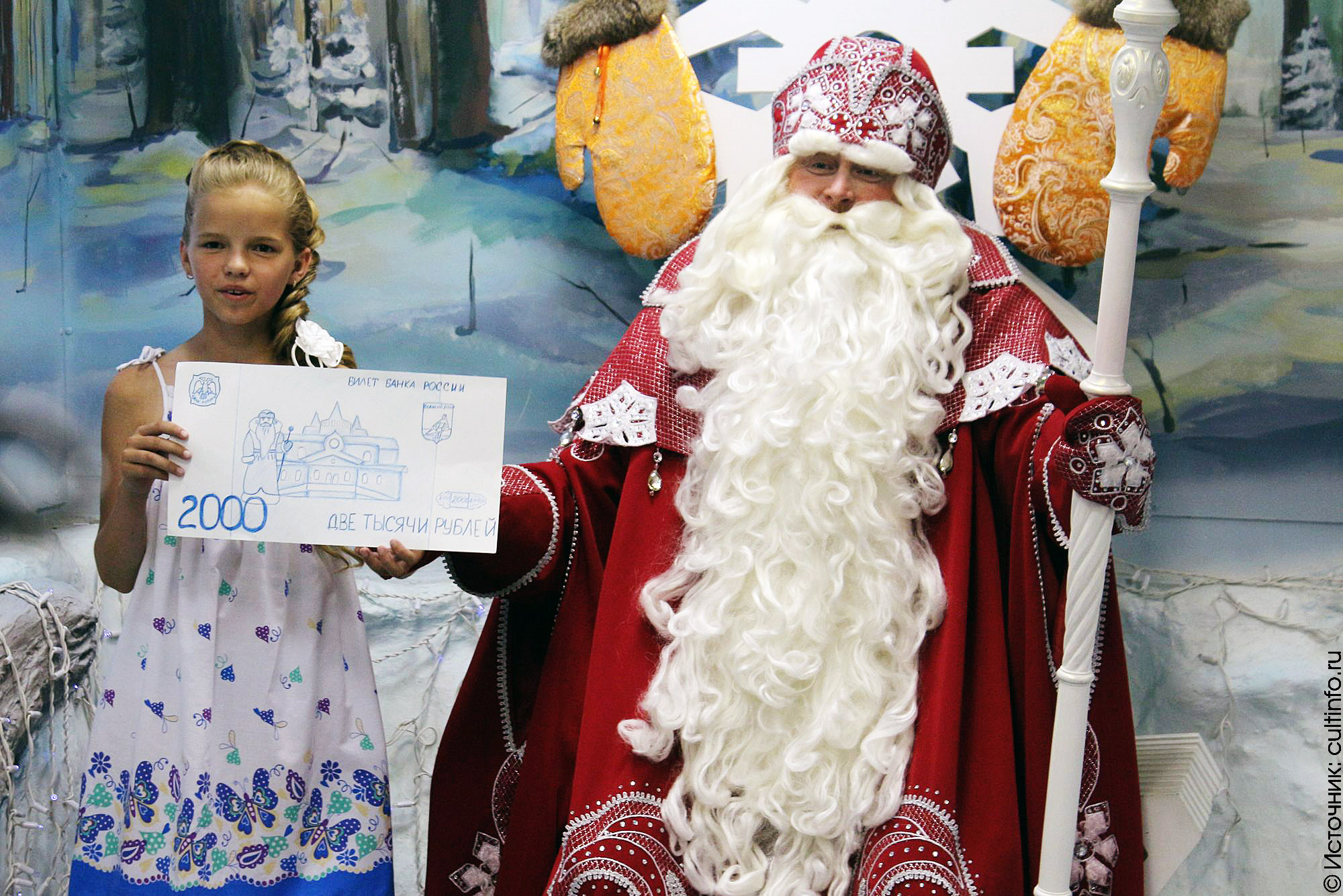 Юная жительница Великого Устюга София Долгина написала письмо председателю Центрального банка РФ Эльвире Набиуллиной, в котором попросила использовать изображение Вотчины Деда Мороза на новых банкнотах номиналом в 2000 рублей. Макет купюры она подарила зимнему волшебнику: торжественная передача эскиза накануне прошла в его Летней резиденции в Вологде.