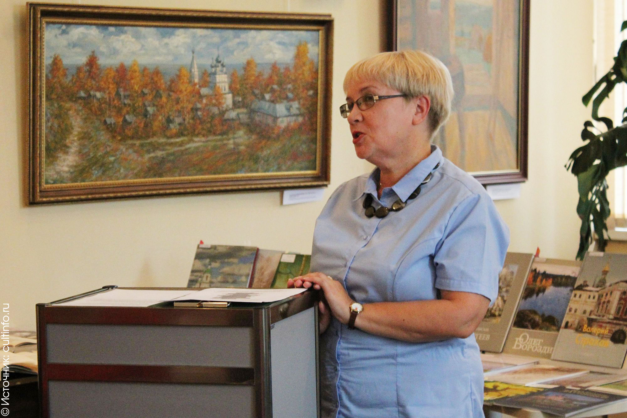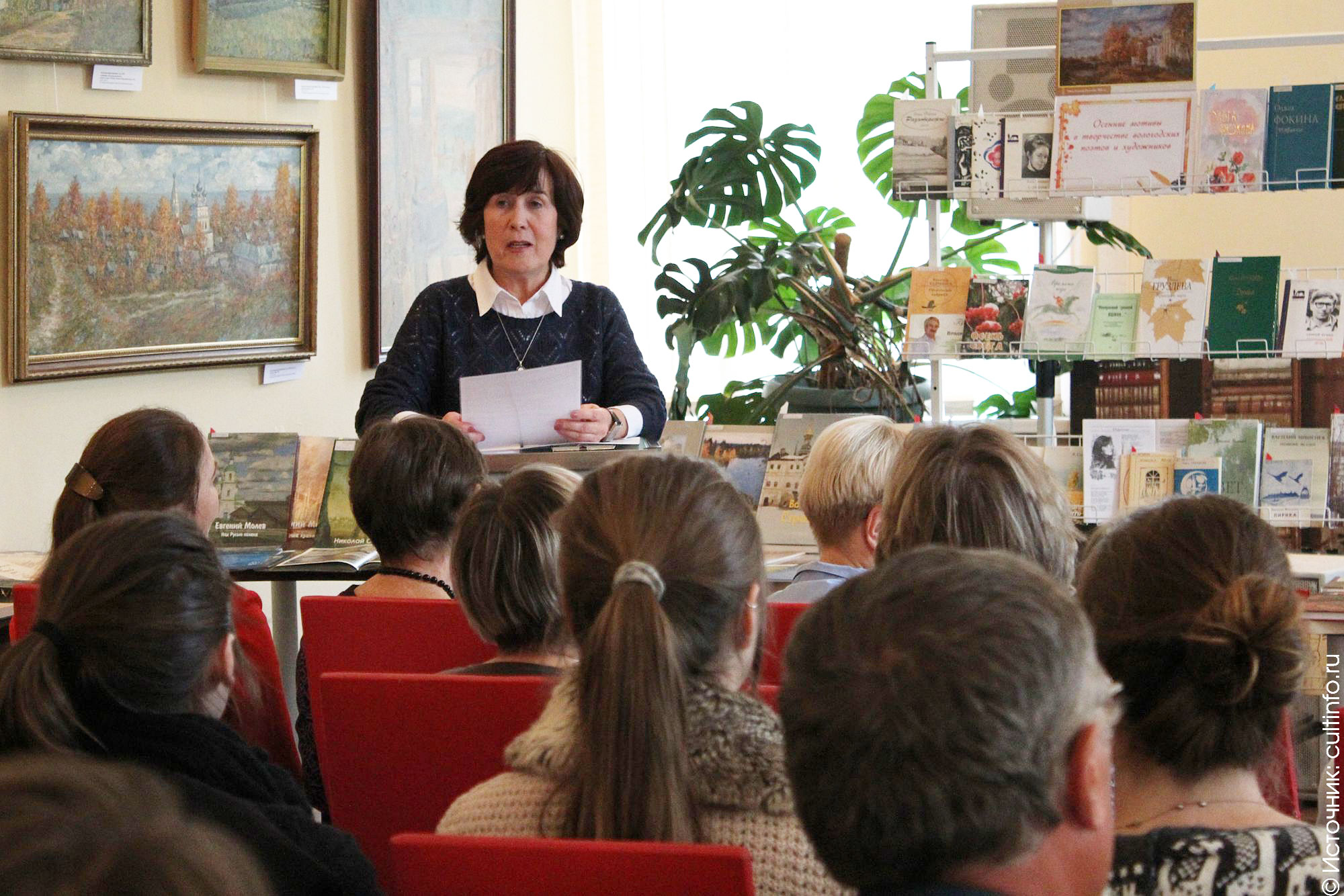 В этот же день презентацию большой литературно-художественной выставки «А, между прочим, осень на дворе…» представили сотрудники Вологодской областной научной библиотеки. Название выставки – строчка из стихотворения Николая Рубцова. Экспозиция объединила живописные полотна из фондов Вологодской картинной галереи и книжные издания из фондов библиотеки.