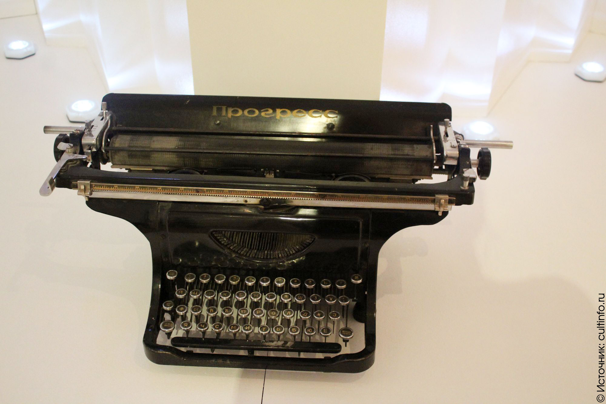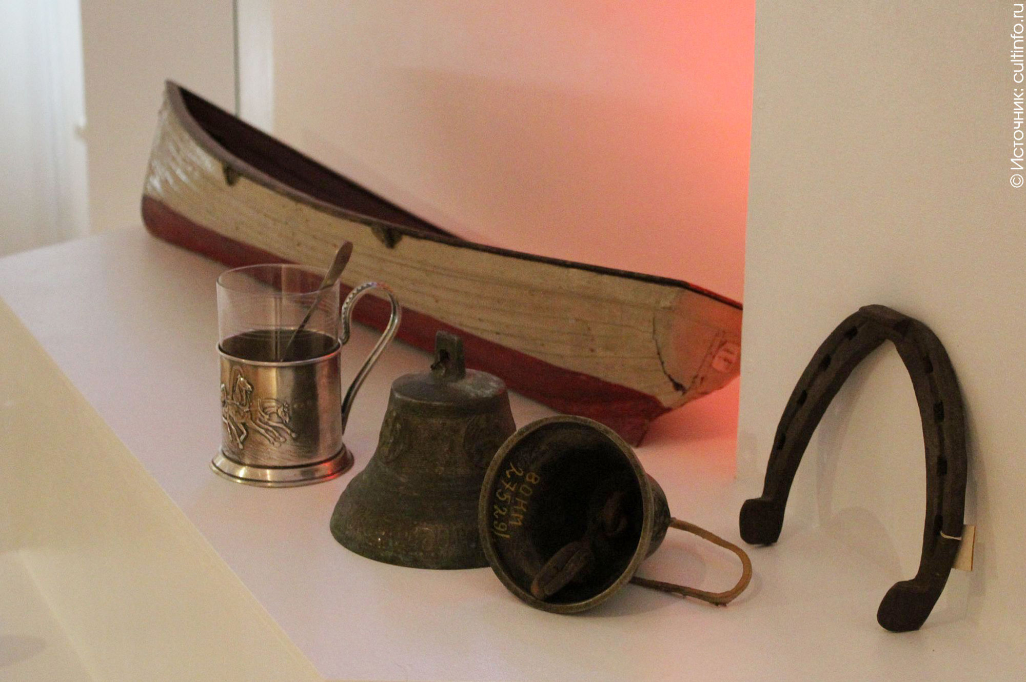 Гильзы на тарелке отсылают к голодному военному детству Рубцова, напоминают о его сиротстве, жизни в детском доме. Лодка («...буду до ночной звезды лодку мастерить себе...») – вечная мечта о свободе, символ пути и одновременно зыбкость, ненадежность этого пути. Часто встречающийся у Рубцова образ коня, верховой езды («Я буду скакать по холмам задремавшей отчизны...») также ассоциируется и со свободой, и с ускользающим временем, которое нельзя повернуть вспять, а часть конской упряжи – колокольчик – одновременно являет собой аллюзию на колокольный звон, благовест, зовущий в храм. Есть в инсталляции и весы, на одной чаше которых – томик стихов, на другой – пустой стакан: символ, если иметь в виду биографию Рубцова, тоже вполне понятый: «Вы понимаете меня. Вы восхищаетесь стихами. Вы поднимаете меня, как поднимаете стаканы...» Есть фонарь, в контексте выставки символизирующий домашнее тепло и свет, луч маяка, который не дает морякам свернуть с пути («Спасибо, скромный русский огонек...») – и одновременно поэтическое озарение, и надежду, и много чего еще... И, конечно, как обойтись без краеугольного камня – вещественного символа творчества – печатной машинки «Прогресс», венчающей перспективу выставки.