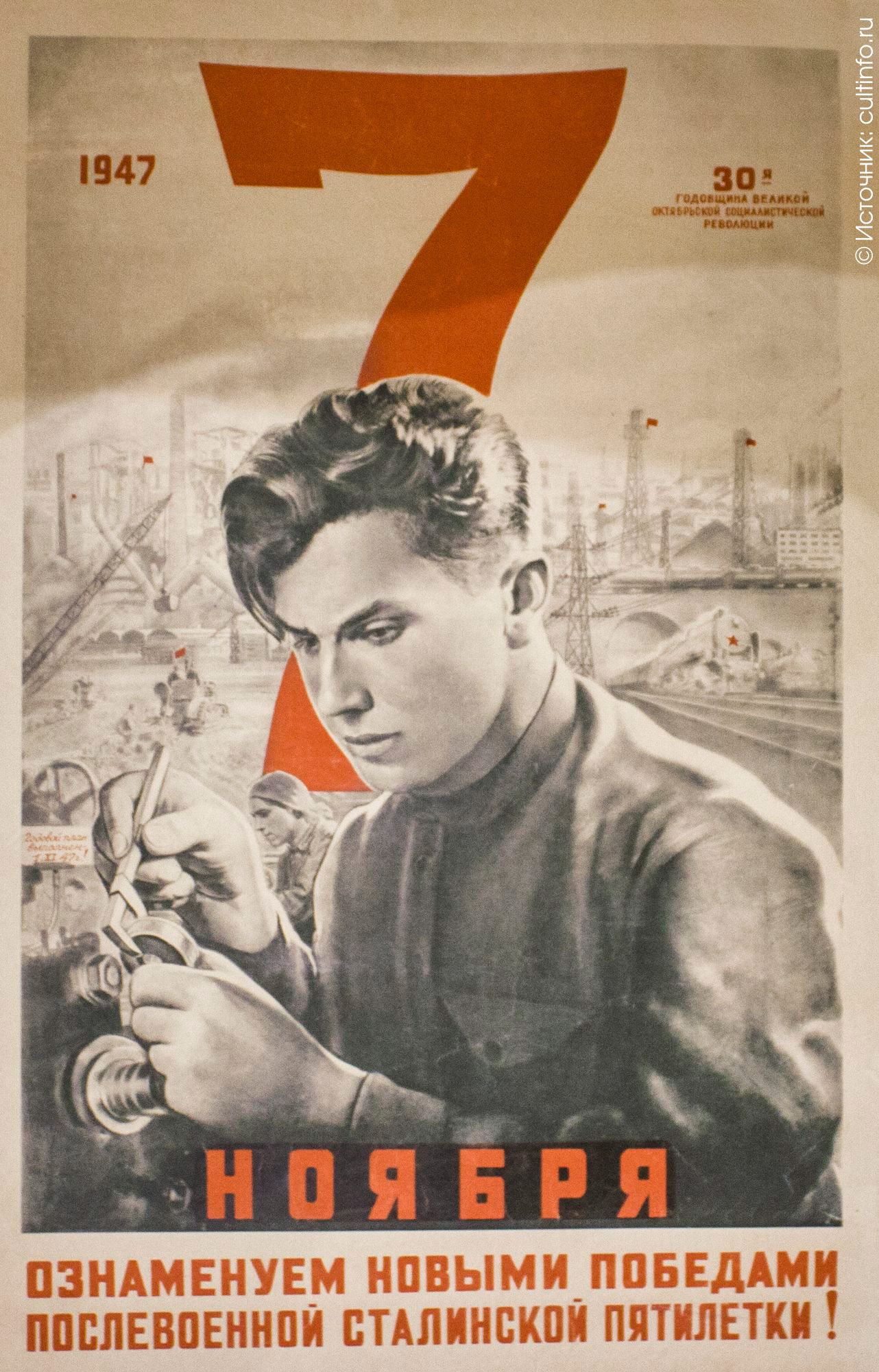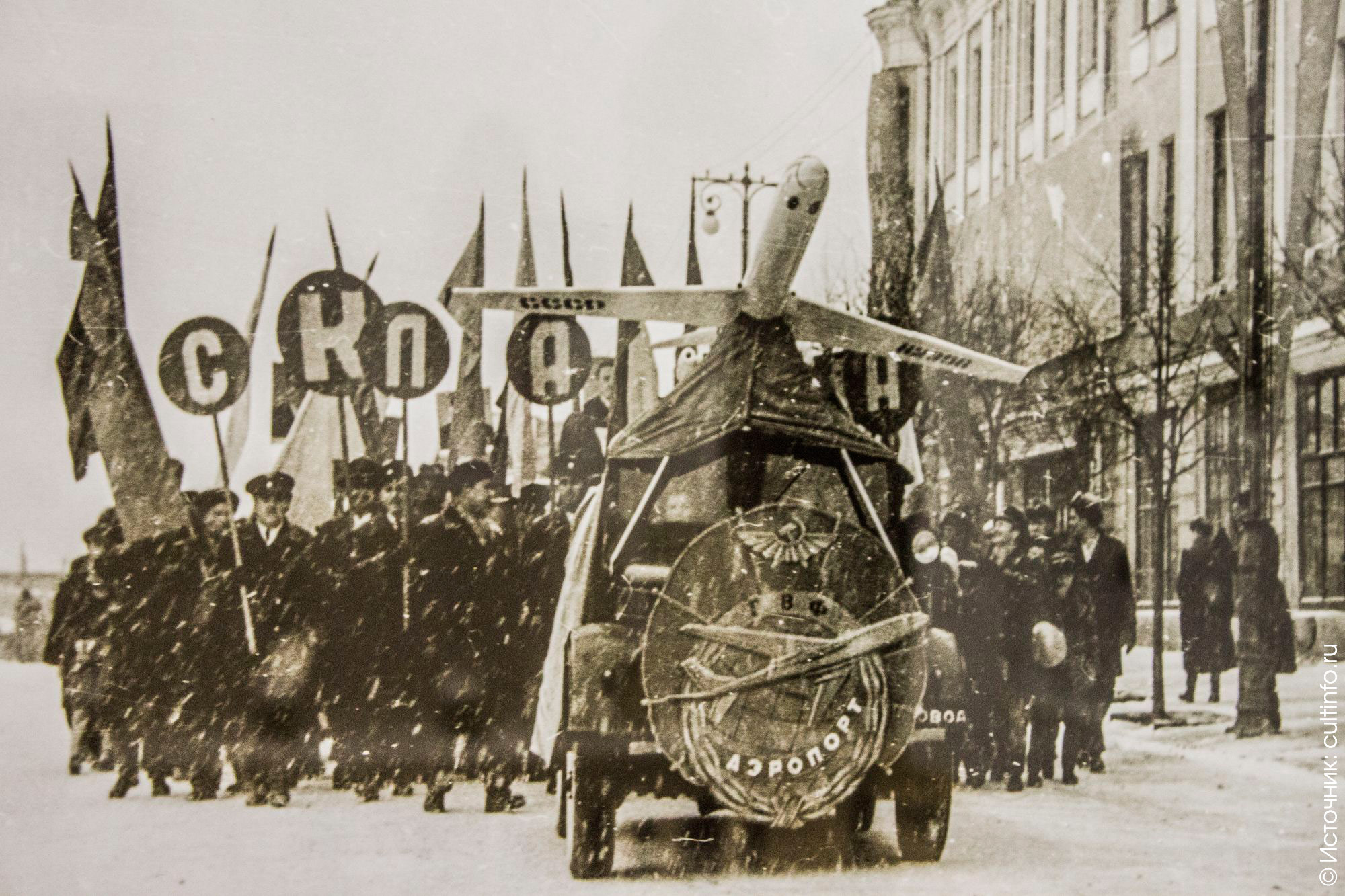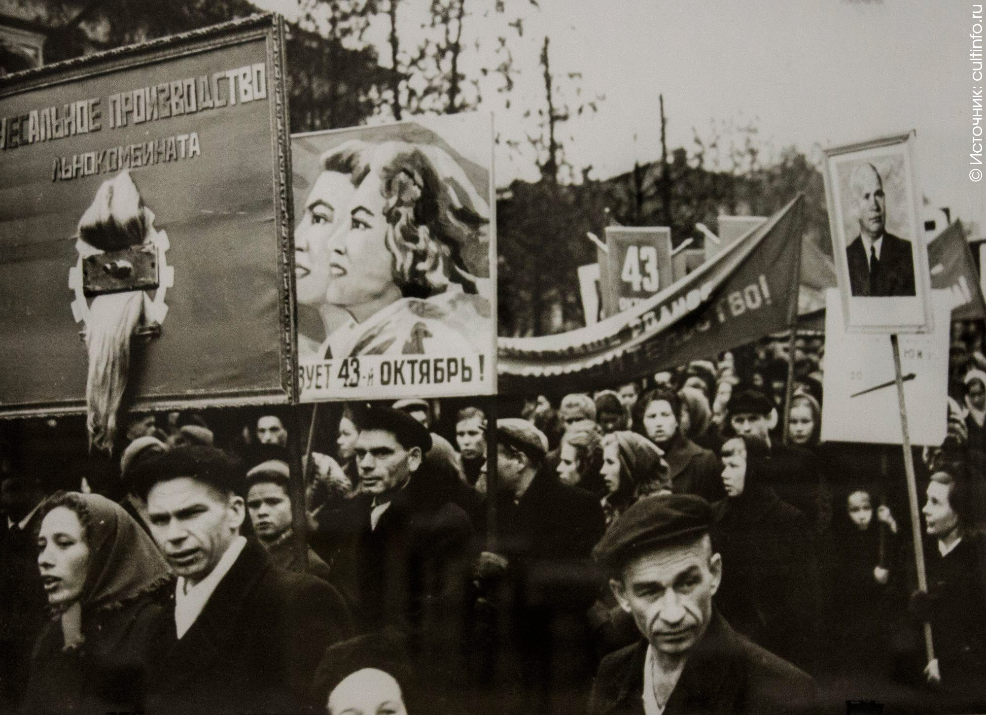 Эпиграфом, задающим тон выставки, по словам Галины Козиной, могло бы стать известное стихотворения Маршака «День Седьмого ноября». В дни празднования годовщины революции город становился красным от плакатов, транспарантов, флагов, которые были повсюду. Снимки отражают и то, как готовились отдельные организации к демонстрациям, создавая дополнительную атрибутику для своих колонн.