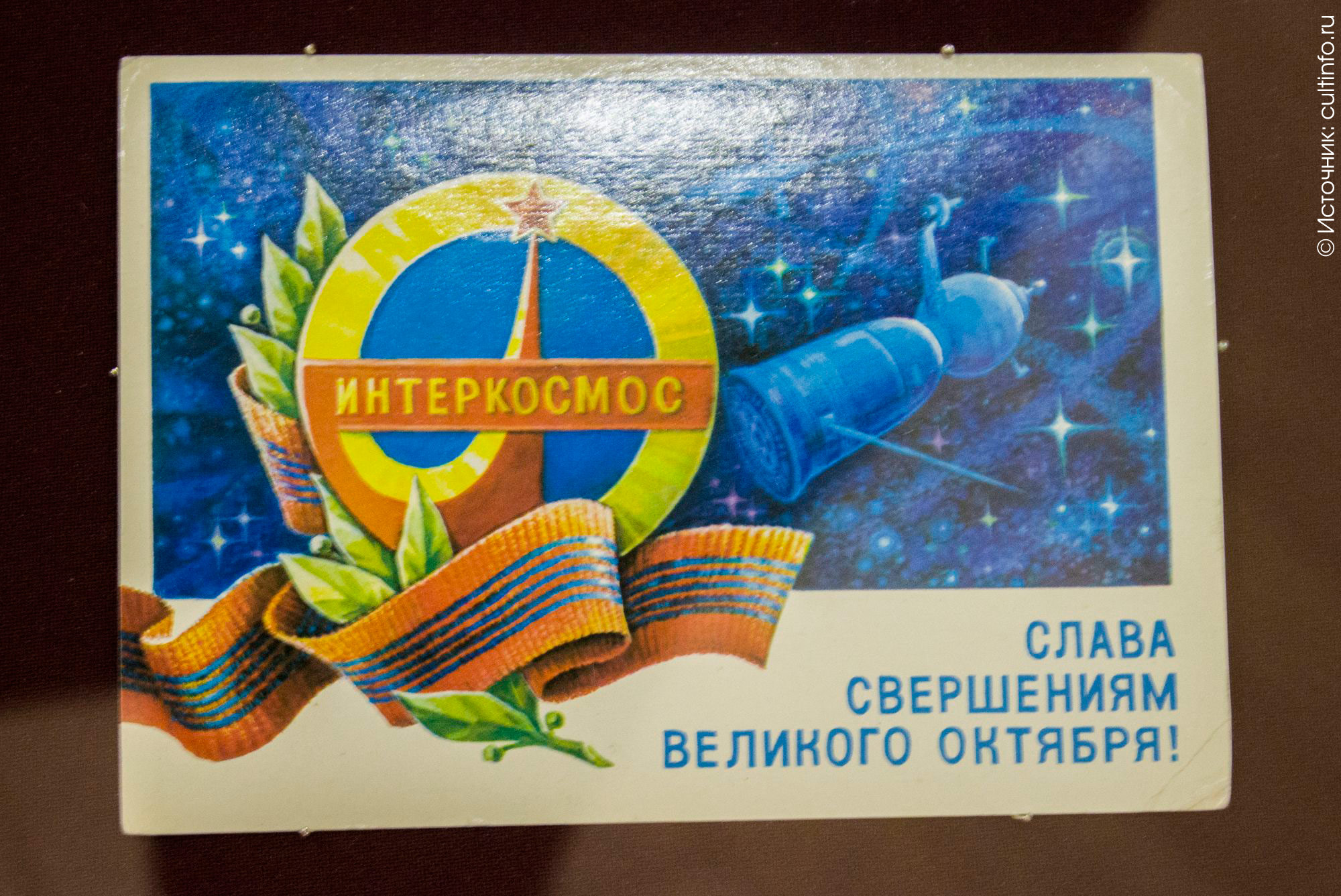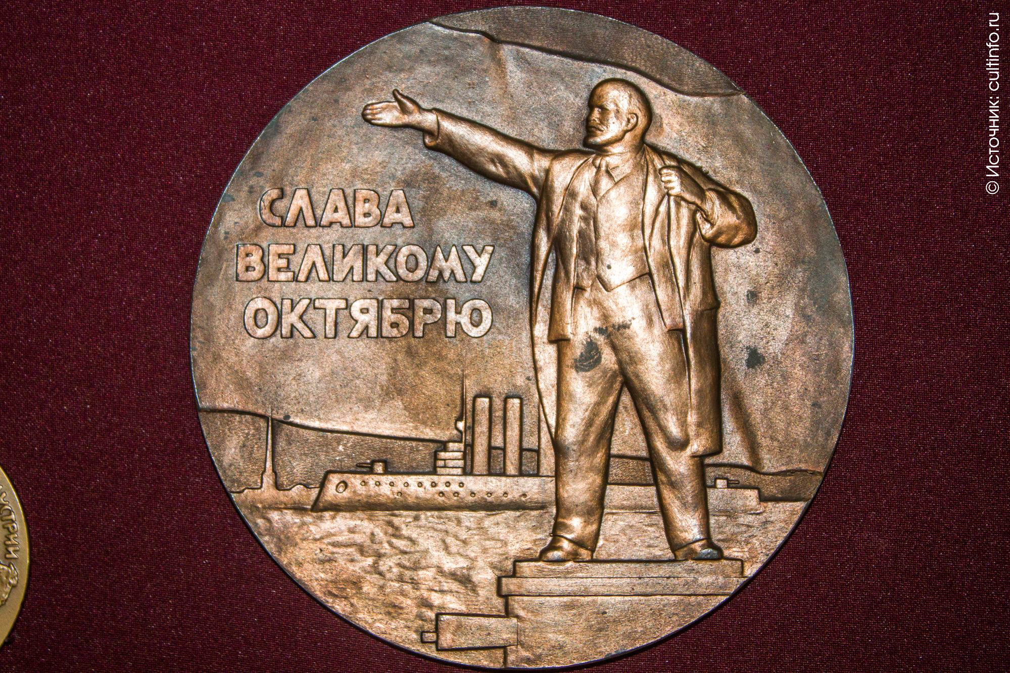 Дополняют экспозицию памятные медали и открытки, славящие «свершения Великого Октября».
