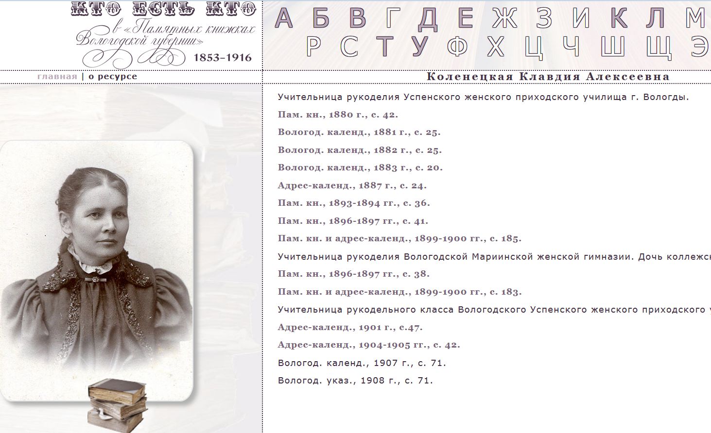Ресурс «Кто есть кто в “Памятных книжках Вологодской губернии”» охватывает 1853 – 1916 гг. Он создан сотрудниками сектора редких книг. Каталог персоналий включает в себя сведения о почти десяти тысячах вологжан и сопровождается справками и фотографиями. Сотрудники библиотеки познакомят посетителей с сайтом и научат искать там необходимую информацию.
