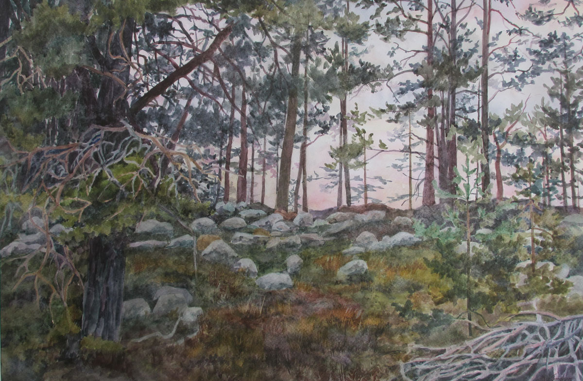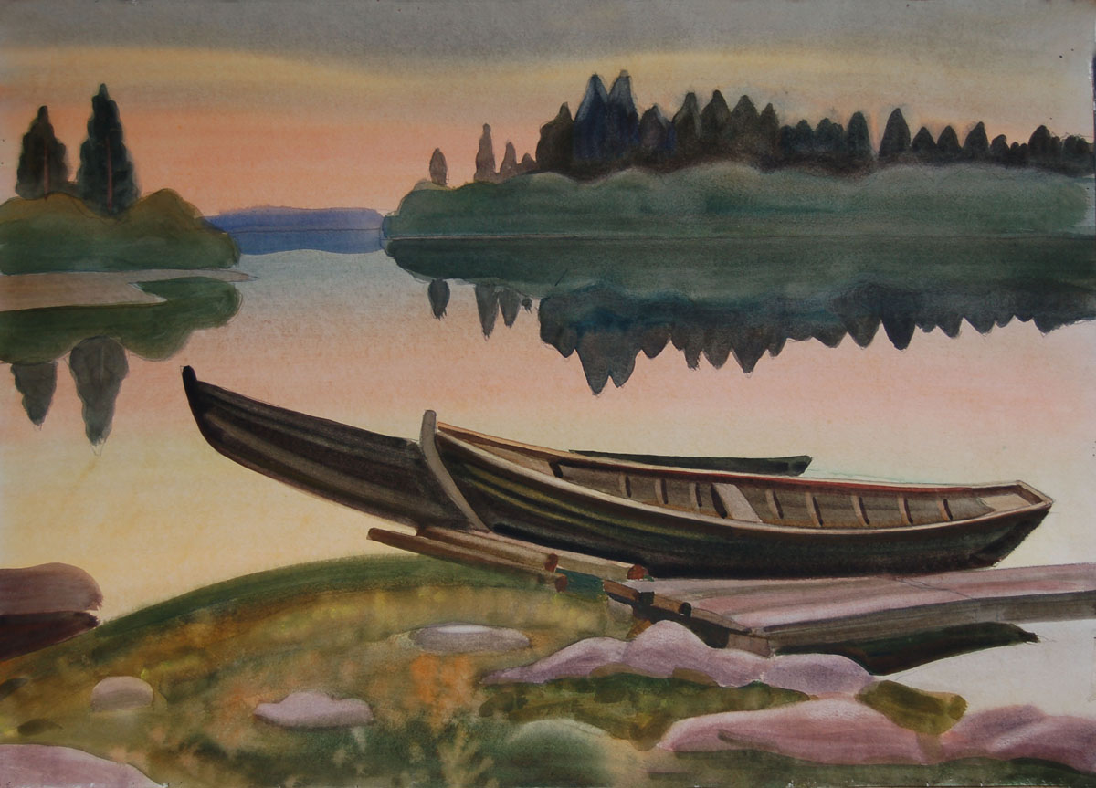 Карелия – удивительный край белых ночей, шумящих сосен и елей, суровых скал, бурных рек с крутыми порогами и голубых озер. Богатство акварельной палитры сродни природе этого края: ярко-синий и свинцово-темный – цвета водной глади, светло-коричневый или зеленый – цвета прозрачного соснового бора, сиренево-алый – цвета неповторимых по красоте закатов. Наверное, ничего удивительного в том нет, что во влажном карельском климате с постоянными ветрами и обилием осадков эта «мокрая» техника с характерными размывками и затеками пользуется большой популярностью у художников.