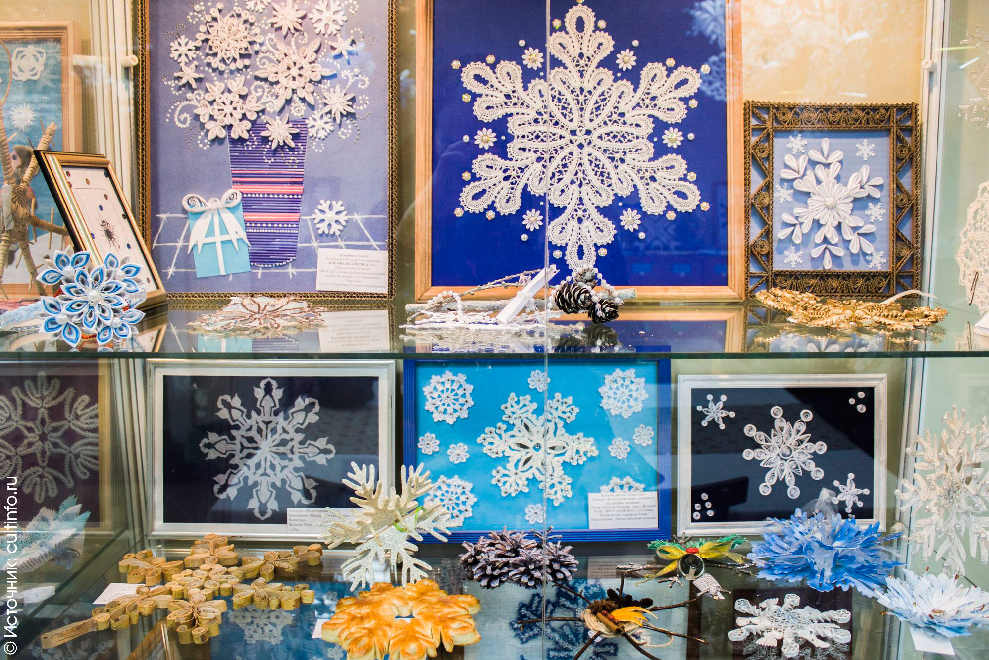 «Наша библиотека превратилась в настоящий зимний сад, – рассказывают библиотекари. – Каких только удивительных снежинок в нём нет! Из бересты, шишек, дерева, теста. Есть металлическая и зеркальная снежинки, кружевные, из бисера и лент, традиционные из бумаги. Вы увидите очень красивые подвески, ловцы снов, композиции, снежинку-книжку, снежинку, обсыпанную кокосовой стружкой, и много-много других удивительных поделок».