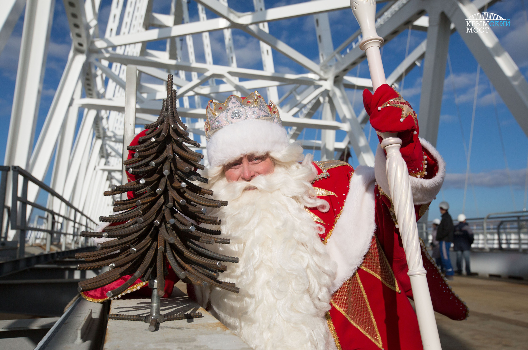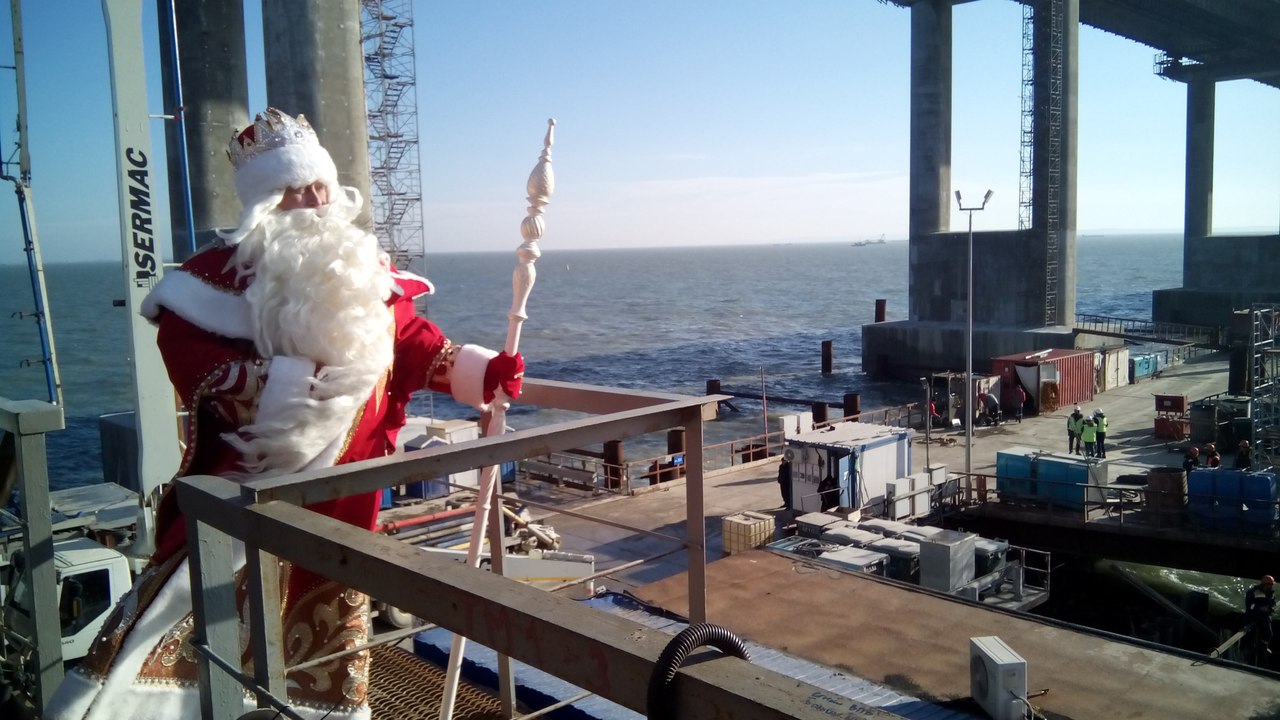 Строители к визиту гостя подготовились: украсили технику мишурой, шарами и снежинками. Сварщики сделали новогоднюю ёлку из арматуры: ее высота 60 сантиметров, а вес – 16 килограммов. «На такой большой стройке порой забываешь про праздники, а Дед Мороз подарил нам новогоднее настроение», – сказал строитель Иван Алексеев. Крымский мост станет самым длинным мостом в России. Его протяженность – 19 километров. Это две параллельно расположенные дороги – автомобильная и железная. Работы ведутся одновременно на всем протяжении объекта в круглосуточном режиме. Автомобильное движение здесь запустят в декабре 2018 года, железнодорожное – в декабре 2019.