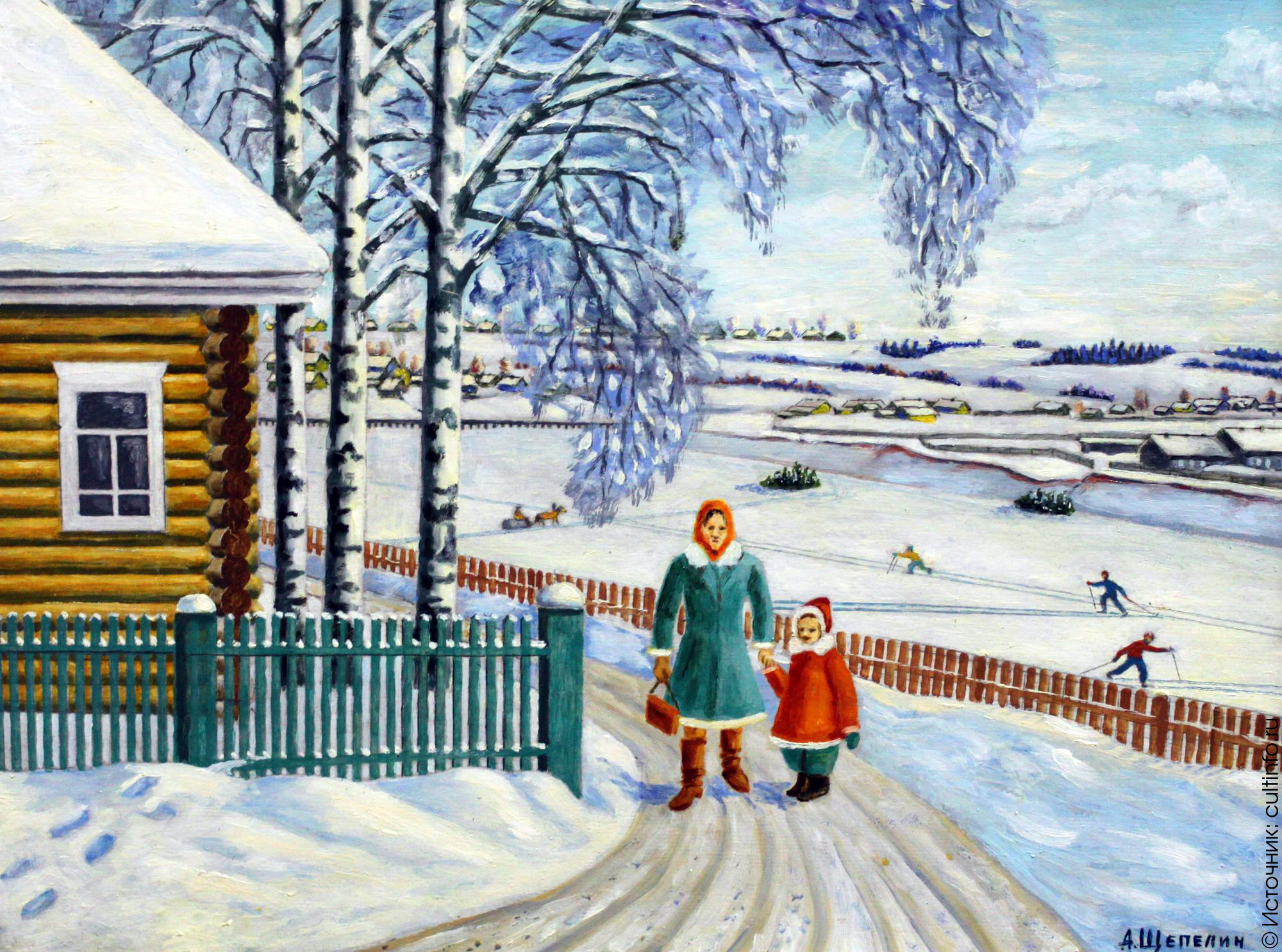 Выставочные произведения взяты из фондов Центра народной культуры. Эта организация (ранее Областной научно-методический центр народной культуры) начала формировать коллекцию работ художников-любителей еще в 1980-х годах. Сначала деятельностью по выявлению талантливых самобытных авторов занимался художник-дизайнер Александр Романов, а затем нынешний директор ДХШ имени Корбакова Наталья Кулижникова. Наталья Петровна защитила диссертацию «Наивное искусство в живописи вологодских художников XX века», а источником ее исследования во многом стала коллекция Центра народной культуры. На открытии выставки искусствовед призналась, что идея показать «зимние» картины возникла не сразу: «Сначала у нас не было четкого мнения о том, что мы хотим выставить, но когда мы пришли смотреть фонды, то сразу же были очарованы потрясающими зимними пейзажами и решили сделать новогодний подарок вологжанам, показав эти работы. Они радуют и вдохновляют, незатейливо повествуя о красотах нашей родины. И они так просты и понятны, что добавлять к ним лишних слов не нужно – мы понимаем, что художники рассказывают нам о том, чем они живут». На выставке представлены работы авторов известных в среде любительского наивного искусства: Т. Шамариной, В. Сивцова, А. Соколова, А. Архипова и других. Красота заснеженной природы, зимние фантазии, мечты о новогодних праздниках звучат в картинах самобытных художников по-особому душевно и тепло.