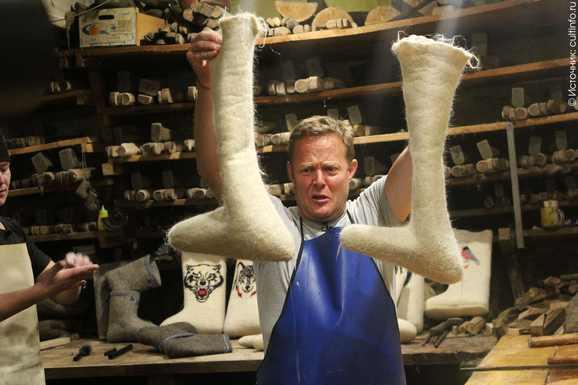 Из мастерской Егора Сайкина ведущий НТВ увез подарок – готовый комплект валенок с логотипом передачи «Поедем, поедим!».