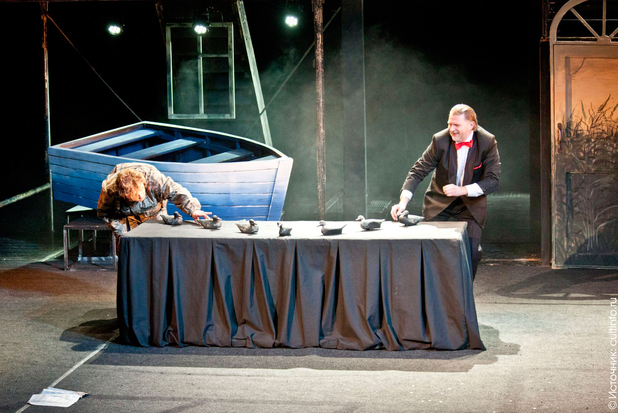 Неослабевающая напряженность действия – заслуга всего актерского ансамбля. Чопорный начальник Кушак (засл. артист России Игорь Рудинский), трусливый подкаблучник Саяпин (Денис Долбышев), его взбалмошная жена Валерия (Яна Лихотина), простодушный Кузаков (Василий Лимонов), грубоватая и броская Вера (Надежда Старикова), наивная Ирина (Анна Терентьева) – все они создают ту среду, которая отчасти объясняет характер самого Зилова. Но особенно ярко он раскрывается во взаимодействии с двумя персонажами – женой Галиной (Екатерина Чаукина) и официантом Димой (Александр Лобанцев). Жена – похоже, единственная женщина, к которой Зилов когда-то испытывал настоящее чувство, но и оно ушло – об этом говорит яркая, эмоционально тяжелая сцена, когда они пытаются вспомнить свое первое свидание. Диме, исполненному достоинства официанту, предстоит полностью преобразиться в охотника – и этот контраст в его характере настораживает и даже пугает.