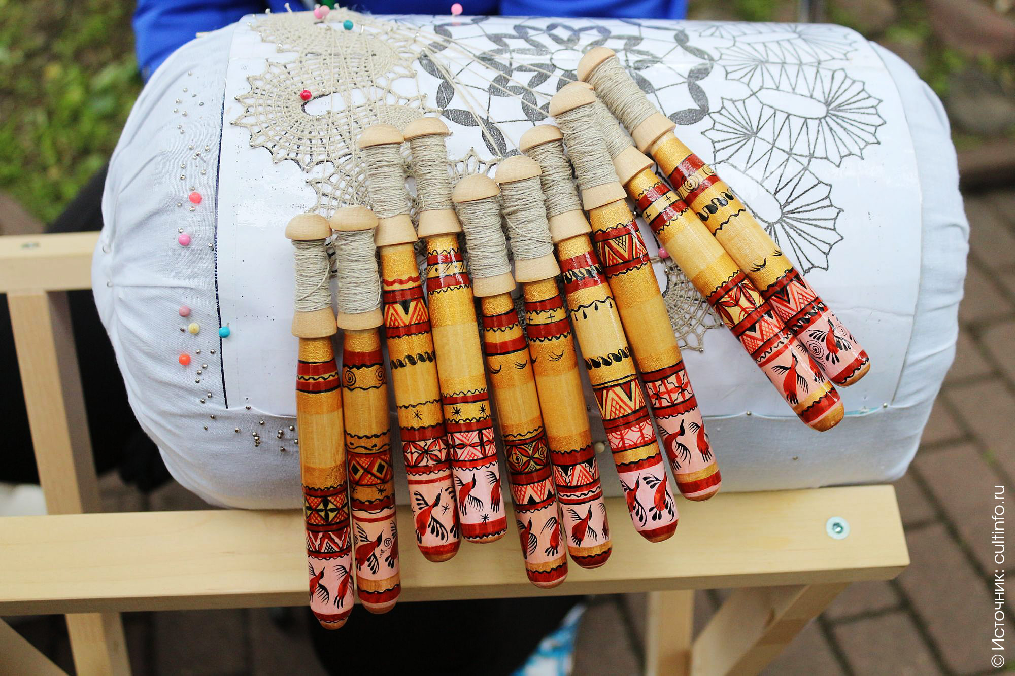Кстати, о коклюшках. Доставило особое удовольствие разглядывать орудия мастериц – настолько они при всей схожести их назначения различны и интересны. Каждый мастер старается изготовить коклюшки «под себя», удобные именно его руке и по возможности не расстается с ними. «Я люблю, чтоб коклюшки были потяжелее, – призналась одна из кружевниц. – Специально для меня мастер в нашем городе изготовил мне увесистые коклюшки из вишни, которые я теперь и использую». Кружевницы бережно и любовно относятсяк своему «техническому инвентарю», многие украшают их, расписывают, придают необычную форму.
