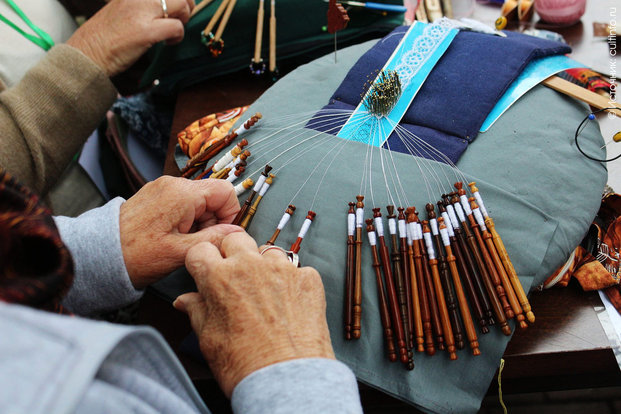 На фоне женщин-кружевниц на кремлевской аллее бросалось в глаза присутствие «особи мужеского полу». Алексей Бойков из Тверской области рассказал cultinfo, что плетет кружево уже более 30 лет и вовсе не считает, что это не мужское занятие. «Если хотите знать, кружево и придумал-то мужик, – сообщил нам общительный Алексей Алексеевич. – Хотя женщины, конечно, более терпеливы. Но есть вот и такие, как я. Живу я в небольшом военном городке, сейчас на пенсии, и рукоделие – мое хобби и средство заработка. Что делать в поселке городского типа вечерами? На танцы – уже старый, да и женат. Футбол не каждый день показывают. Спиваться не хочется. Вот и нашел себе отдушину (улыбается)». Кружевному делу Бойков научился у мастерицы из Вологды: в Доме офицеров их поселка вела курсы вологодская кружевница. И не только кружевную премудрость постиг терпеливый мужчина, в его арсенале разные виды рукоделия: макроме, машинное вязание, кружево, фриволите. Но кружево остается любимейшим занятием. На фестиваль «Vita Lace» Бойков приехал впервые, но в Вологде до этого уже раз побывал: «Сын у меня служил под Вологдой, я приезжал к нему. Поскольку кружевом занимаюсь, зашел в Музей кружева, а вот на фабрику «Снежинка» меня не пустили – у нас в военный закрытый городок проникнуть легче, чем к вам на кружевную фабрику. Наверное, боятся, что секреты украдут», – смеется Алексей Алексеевич.