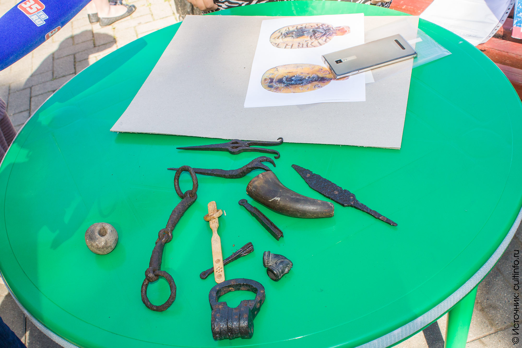 Одним из самых интересных этапов квеста стало знакомство с археологическими находками Вологодского городища. Ксения Зеленцова, ведущий специалист-археолог АУК ВО «Вологдареставрация» показала участникам обнаруженные предметы начала XIX века, историческая ценность которых очень велика. Старинные вещи, добытые из недр земли: зубная щетка (щетина не сохранилась до нашего времени) и колечко из кости, нож, ключ, замок, курительная трубка, упряжь коня и грузило для рыбной ловли позволяют сделать выводы, что в те времена горожане соблюдали гигиену, занимались охотой, рыболовством. «Я четверть века занимаюсь археологией города Вологды и могу сказать, что наиболее значимые из обнаружений – это берестяная грамота, деревянные конструкции, которые говорят нам о развитии и планировке города. И надеюсь, что самая главная археологическая находка ждет меня впереди», – поделился Игорь Кукушкин.
