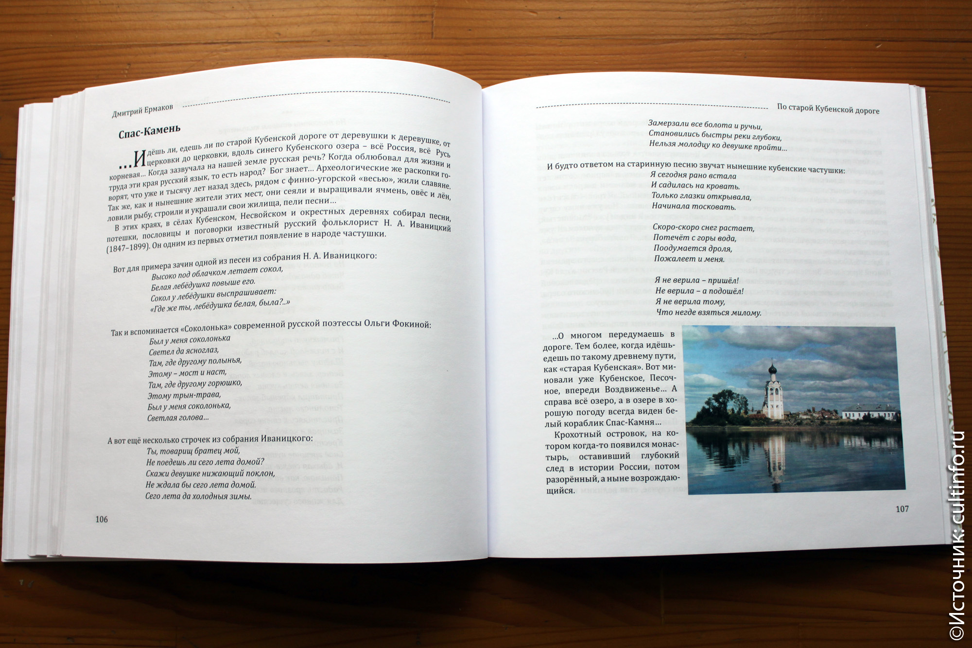 Не зря говорят, что нельзя любить то, чего не знаешь. Автор этих путевых очерков знает, кажется, всё об истории этих мест и их жителях. Дмитрий Ермаков ведет своего рода диалог с писавшими об этой земле раньше: «Обширное цитирование тех, кто писал до меня об этих местах, показалось мне необходимым. Некоторых авторов уже почти забыли, и о них нужно напоминать, а без рассказа, например, о Спасо-Каменном монастыре вообще, по-моему, невозможна книга о Кубеноозерье...». Каждая церковь, действующая или разрушенная, вызывает у писателя желание узнать о том, как она строилась, кто там служил или служит сегодня. Каждая деревня, даже пустая или населенная одними дачниками, заставляет вспомнить о других временах – когда здесь было много дворов, в полях кипела работа, а сельские праздники радовали многолюдьем. О людях, которые родились или жили здесь и оставили о себе память – хоть в сердцах односельчан, хоть в истории всей Вологодчины – Дмитрий Ермаков готов размышлять и говорить бесконечно. И каждая из этих историй, вроде бы незатейливая, погружает в давнюю и недавнюю историю лучше, чем любой учебник…
