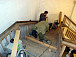 На внутренней лестнице колокольни уже начался процесс замены изношенных ступеней. Один из работников демонстрирует нам стертую доску ступени, извлеченной из лестницы. «Ступени разной сохранности, где-то они достаточно изношены, где-то имеют трещины», – говорит реставратор. Ольга Александровна замечает, что в целом сохранность деревянной лестницы, которая сделана еще в XIX веке, неплохая. «Удовлетворительна сохранность маршей, поручней, подшивка из хороших досок, закрепленных коваными гвоздями. Поэтому было принято решение заменить только изношенные доски – в основном, в тех местах, где лестница делает повороты и нагрузка на ступени максимальна». На первый взгляд, выборочно заменить доски в лестнице – просто, но на самом деле это не так, поясняет реставратор: «Заменить отдельные ступени, не трогая подшивки, на самом деле довольно трудоемко. Ступеньку и подступёнок (очень колоритное название конструктивного элемента – прим.авт.) нужно доставать из пазов снизу, со стороны подшивки, это долгий процесс. Мы решили попробовать такой метод, без снятия подшивки – его часто используют за границей. Если он окажется приемлемым, мы будем пользоваться им и дальше».