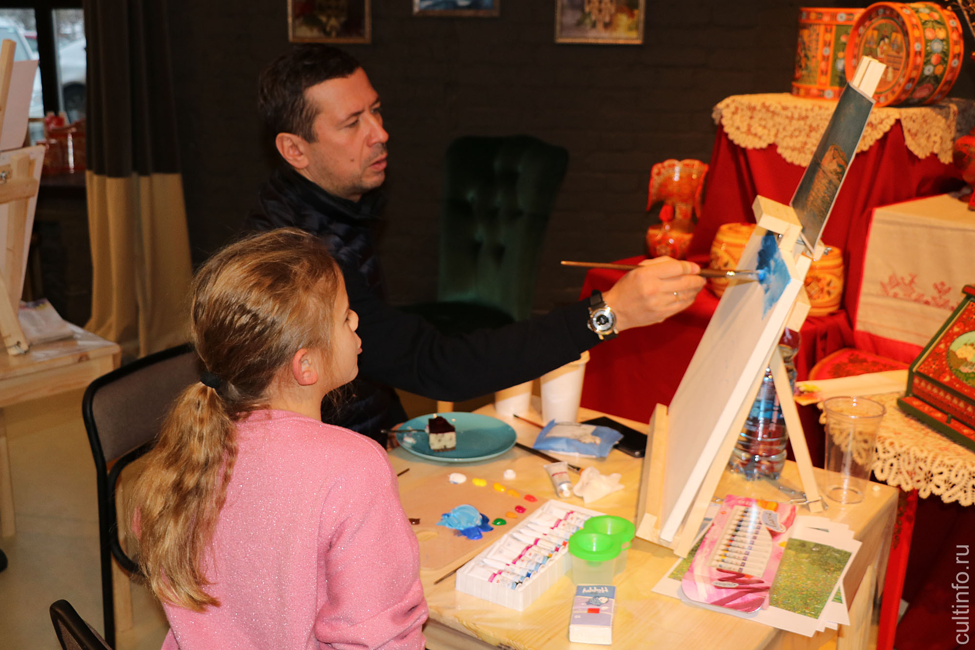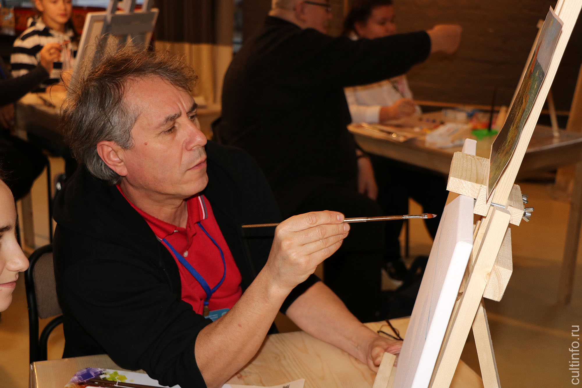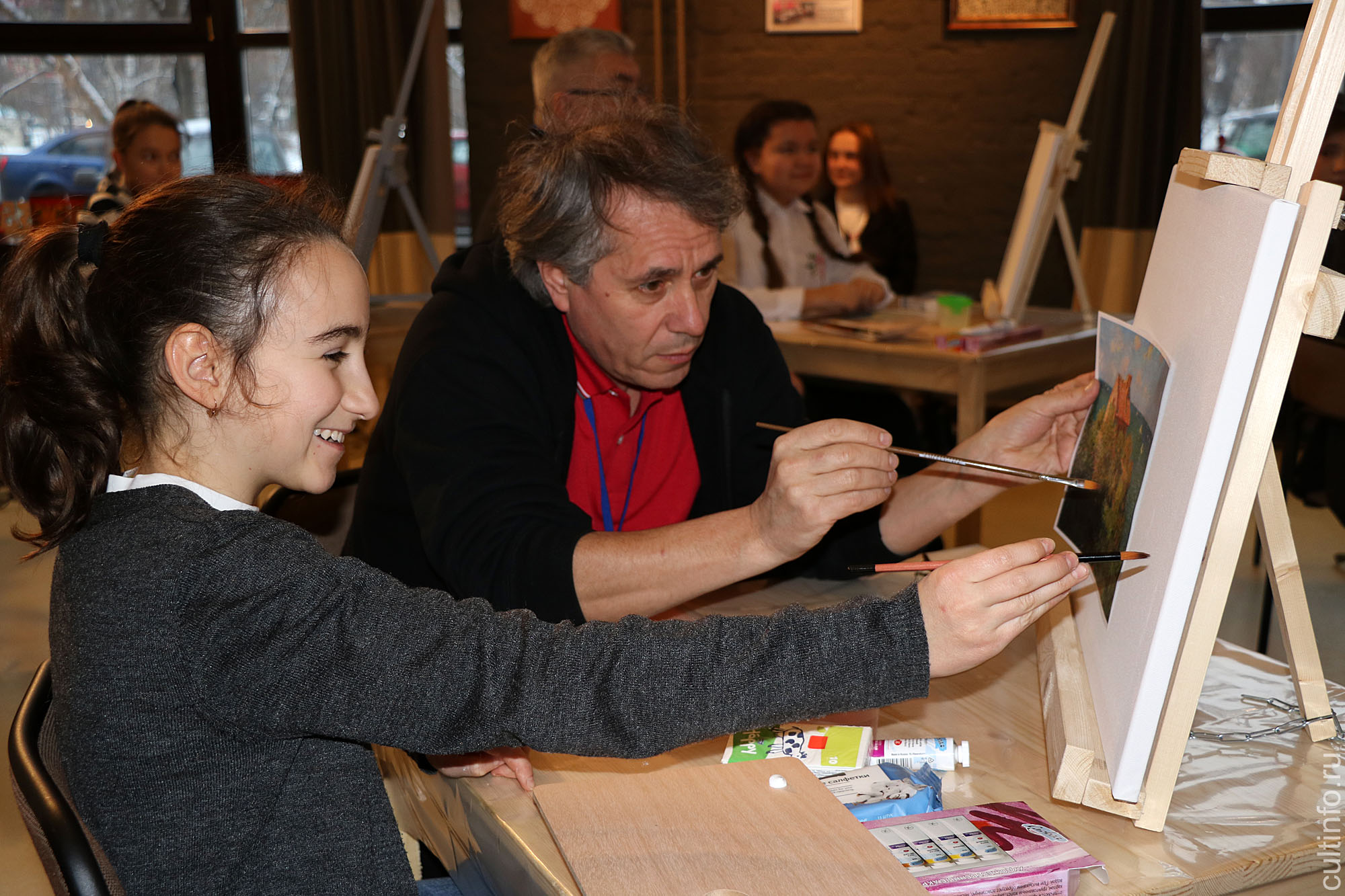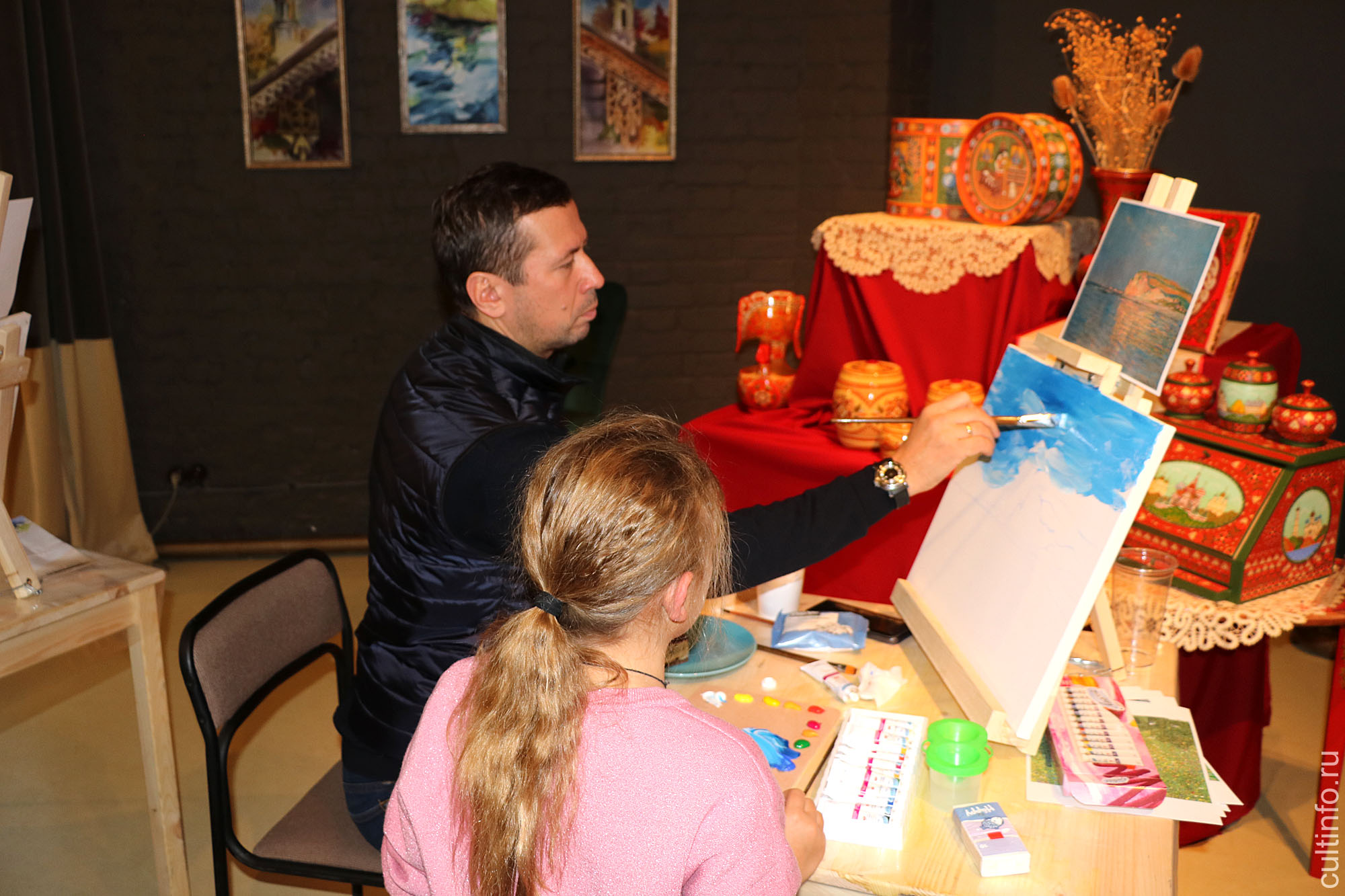 Якутский живописец Семен Луканси провел для вологжан мастер-класс по живописи. В нем приняли участие и гости фестиваля «Свидание с Россией», в том числе кинокритик Андрей Шемякин, режиссер и продюсер Наталья Лисовская и актер Андрей Мерзликин с дочкой. Мольберт и холст они делили на двоих с юными художниками – участниками мастер-класса. Перед ними стояла задача написать пейзаж – свою вариацию с репродукции картин. Семен Луканси рассказал и показал им, как распределить цвета на палитре, разметить холст, правильно нанести краску, определить линию горизонта и, главное, как с помощью тонов и полутонов выразить эмоции. «Нужно избавиться от барьеров и страхов, – напутствовал участников художник. Поэтому я подхожу и немного порчу ваши работы, чтобы вы потом исправляли».