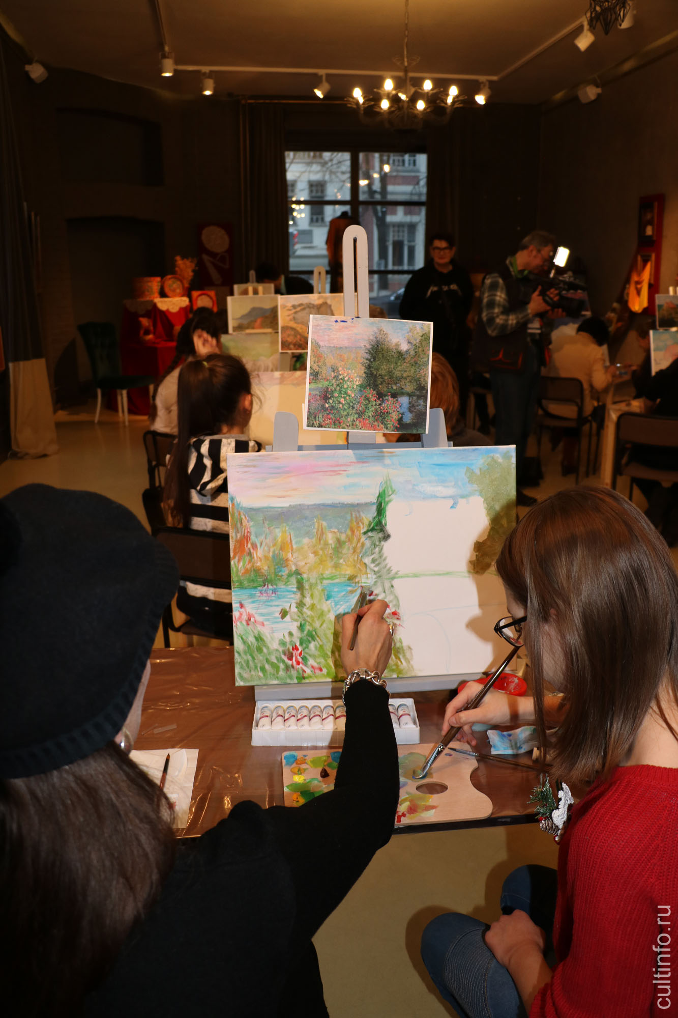 Андрей Шемякин работал в паре со школьницей Катей Моховой. Он поделился с cultinfo впечатлениями: «Я мгновенно вижу свои ошибки, где-то надо было быть более осторожным, чутким…В первоисточнике у Клода Моне – масса тональных переходов. Самое интересное – мазок, у художника он нежный, а у меня получается более жесткий. В этом есть контраст. Мы с Катей предлагаем свою вариацию на тему Моне. Вообще, моя задача, как кинематографиста, правильно выстроить композицию на холсте, тем более там такая выразительная внутренняя драматургия».