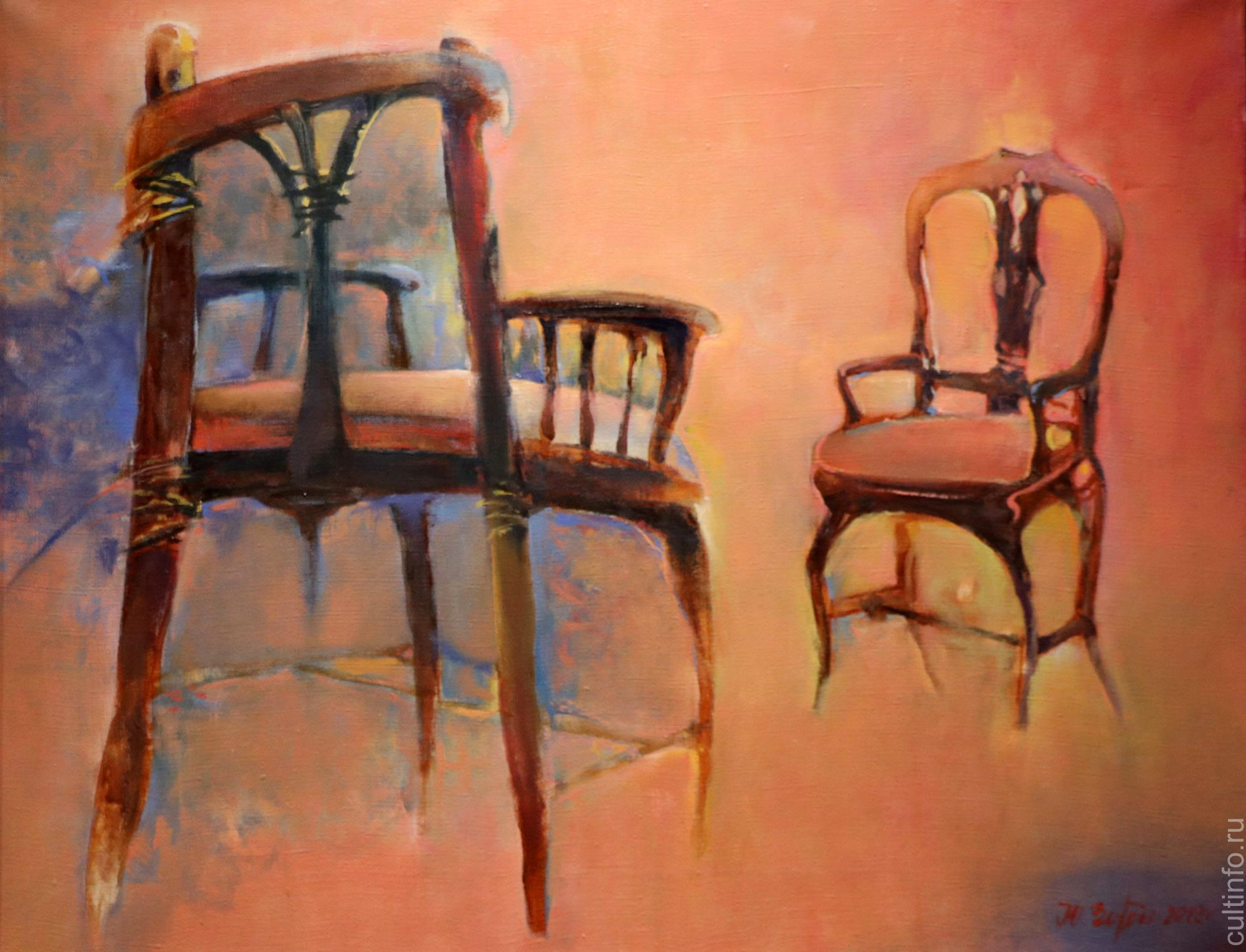 Выросший в индустриальном Челябинске Юрий Зотов (р. 1959) называет себя романтиком. Участник знаменитого объединения «Солнечный квадрат» объездил полмира и обосновался в Вологде. «Но это не последняя остановка», – уверяет он, намекая на Нью-Йорк. На выставке показывает работы разных лет, среди которых произведения из незатейливой, на первый взгляд, серии «12 стульев». Что «зашифровано» в каждом стуле, знает, скорее всего, только сам автор. Например, картина «Тет-а-тет» (с виду просто два стула) – непринужденная беседа «дедульки» и молодой барышни.