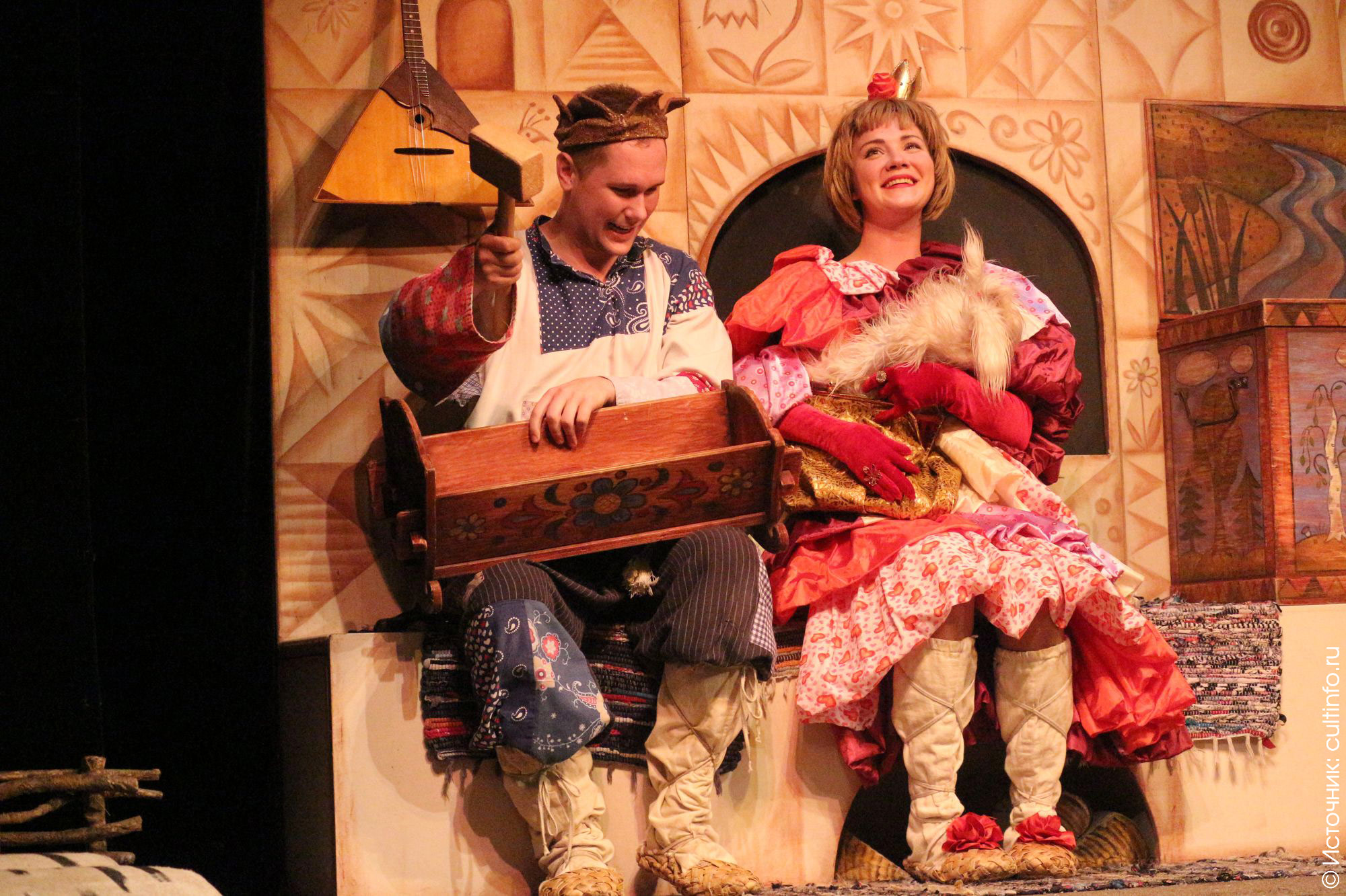 Скоморошья потеха «Поехали!», которую москвичи представили во второй день гастролей, поразила энергетикой и множеством режиссерско-актерских находок. Сюжет спектакля можно рассказать буквально в двух предложениях: герой – собирательный образ Ивана-дурака из русских народных сказок – поймал волшебную рыбу, подарившую ему волшебный же кубарь (старинная детская игрушка – разновидность волчка). С помощью кубаря Ваня сначала становится царем, потом чуть не женится на принцессе, но, вовремя спохватившись, выбирает себе невесту по плечу – простую и работящую девушку Маню. Однако главное в спектакле было не «что», а «как»: весело, зажигательно, остроумно, интерактивно и чудесно. Дети на спектакле (особенно повезло первым рядам) были полноценными участниками действа: они и волны раскачивали, и рыбу ловили, и уворачивались от брызг из кадушки, и собирали внезапный снег, и капусту помогали вырывать, и даже ехали в погоню за аистом. А взрослые смаковали колоритную речь героев, аплодировали метким высказываниям, порой тянущим на афоризмы: «Да, легче царство раздобыть, чем старого друга вернуть»; «Ну и невесты пошли – булки у них на деревьях растут». В спектакле легко узнается творческий почерк замечательного режиссера Бориса Константинова, неоднократного обладателя «Золотой маски», известного вологодским зрителям по таким хитам «Теремка» как «Кармен» и «Слово о попе и о работнике его Балде». Ну а актерский ансамбль (всего из троих человек!) заслуживает отдельных слов похвалы и зрительского признания.