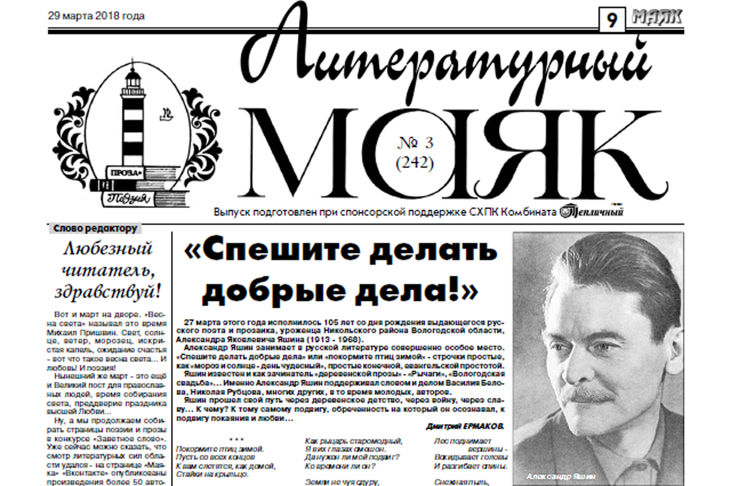 В марте на Вологодчине традиционно отмечаются две «литературные» даты. 27 марта исполнилось 105 лет со дня рождения выдающегося русского поэта и прозаика, уроженца Никольского района Вологодской области Александра Яковлевича Яшина (1913-1968). Читателям газеты предлагают вспомнить самые популярные строки автора – «Спешите делать добрые дела», «Покормите птиц зимой», «Я обречён на подвиг» и другие.