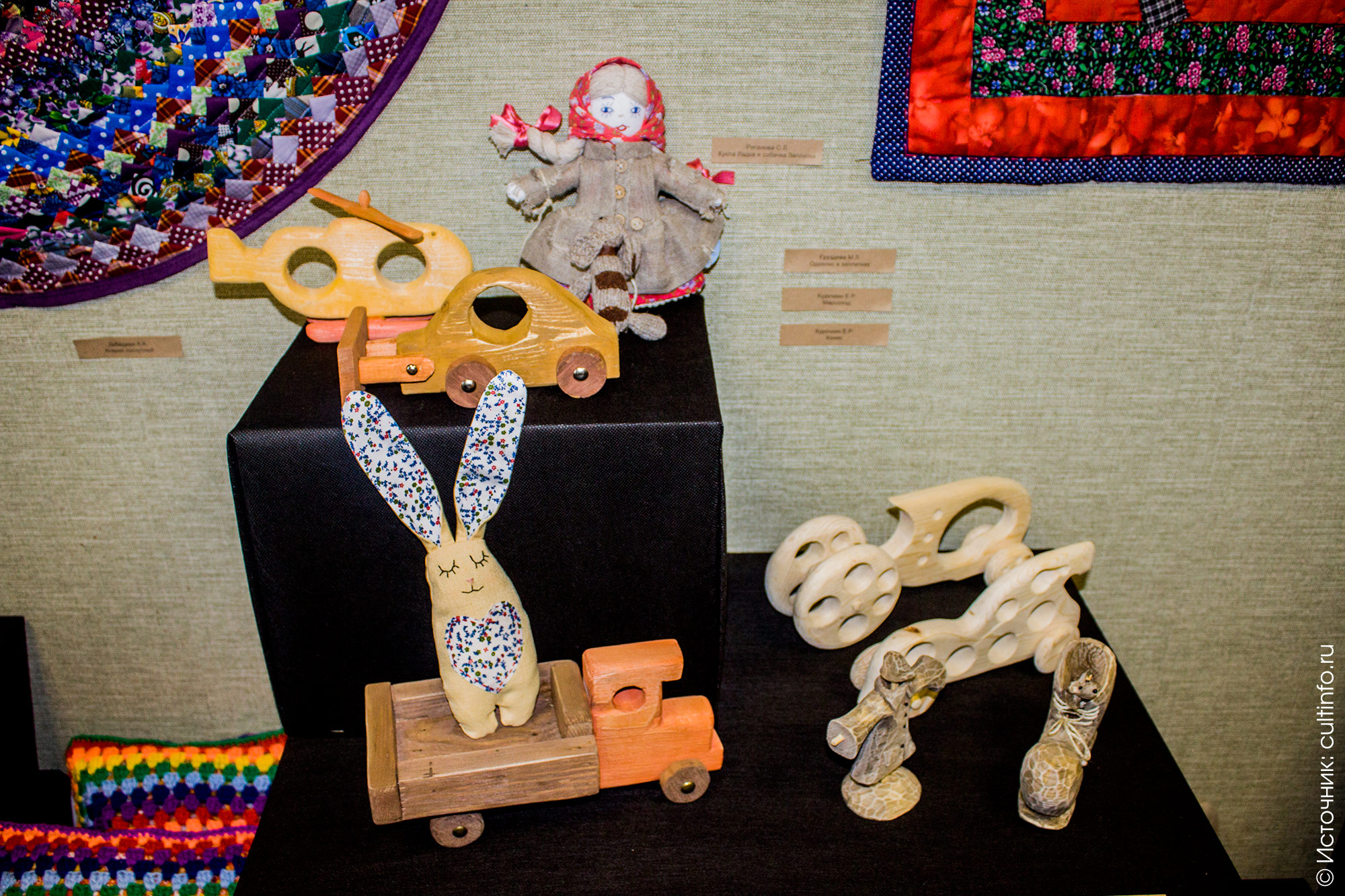 Этот выставка была задумана организаторами – Центром ремесел «Резной палисад» – как праздничный неформальный проект. Рассказывает методист центра Ирина Ермакова: «Мы специально не давали мастерам никаких конкретных рекомендаций, не ограничивали их ни в техниках, ни в материале, ни в размерах изделия. Интересно было посмотреть, как они смогут творчески воплотить идею, подкинутую извне». Хотя работ на конкурс представлено немного, все они действительно показывают, как по-разному можно трактовать тему «дыр и заплат». У кого-то это одежда с элементами лоскутного шитья и аппликации вязаными украшениям, у кого-то – вырезанная из дерева абстрактная композиция с самыми настоящими «дырами». Есть здесь и кованые «заплаты», из которых составлен оригинальный кувшин, и керамика, и вязание, и лоскутные куклы. Свои изделия представили не только взрослые умельцы: коллекция деревянных автомобилей выполнена учениками Евгения Курочкина, известного мастера резьбы по дереву.