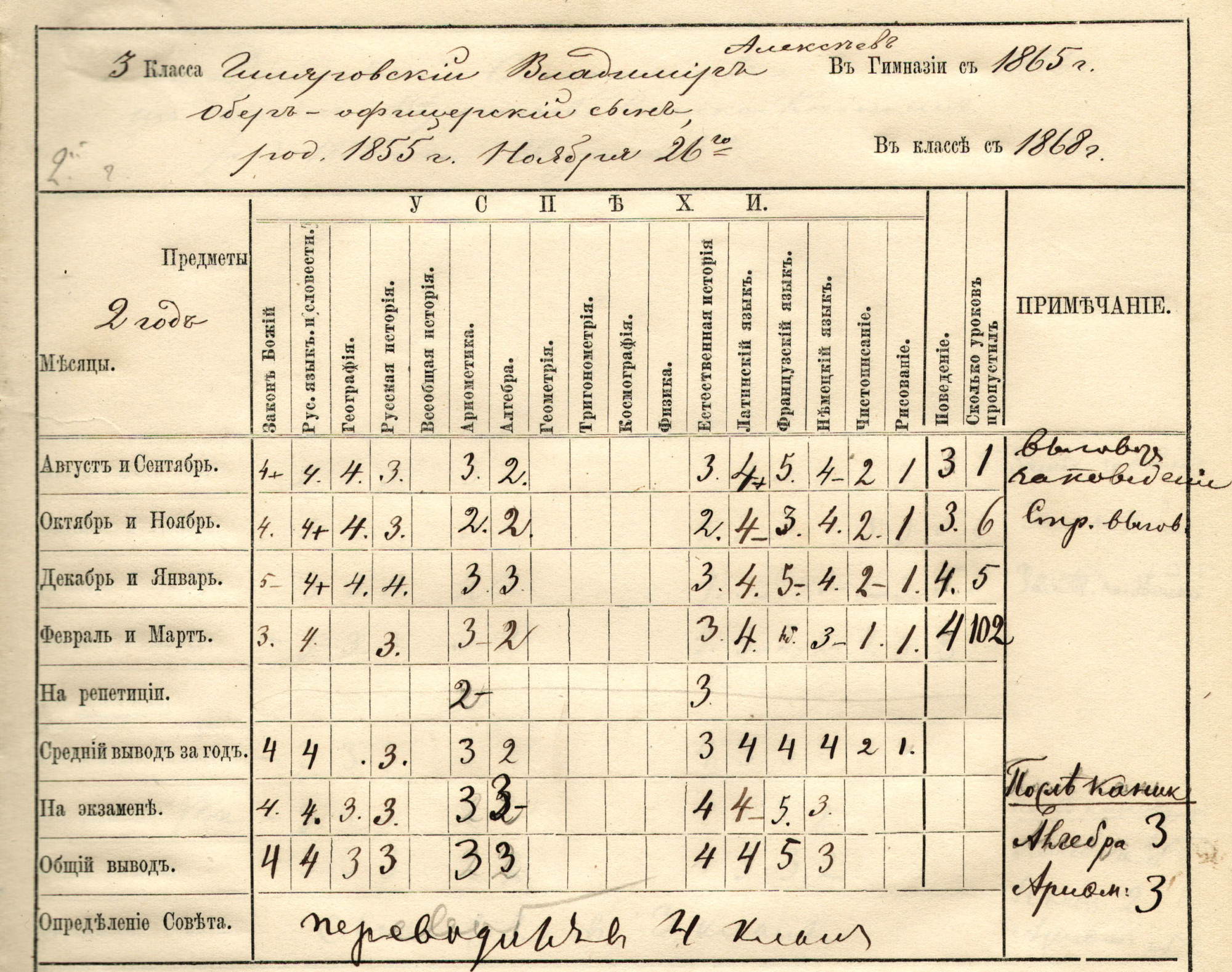 Совместный проект портала cultinfo.ru и Государственного архива Вологодской области «Архив 100х100» представляет следующие архивные документы, хранящиеся в фондах ГАВО, – это запись о рождении Владимира Гиляровского и ведомость об успехах и поведении гимназиста.