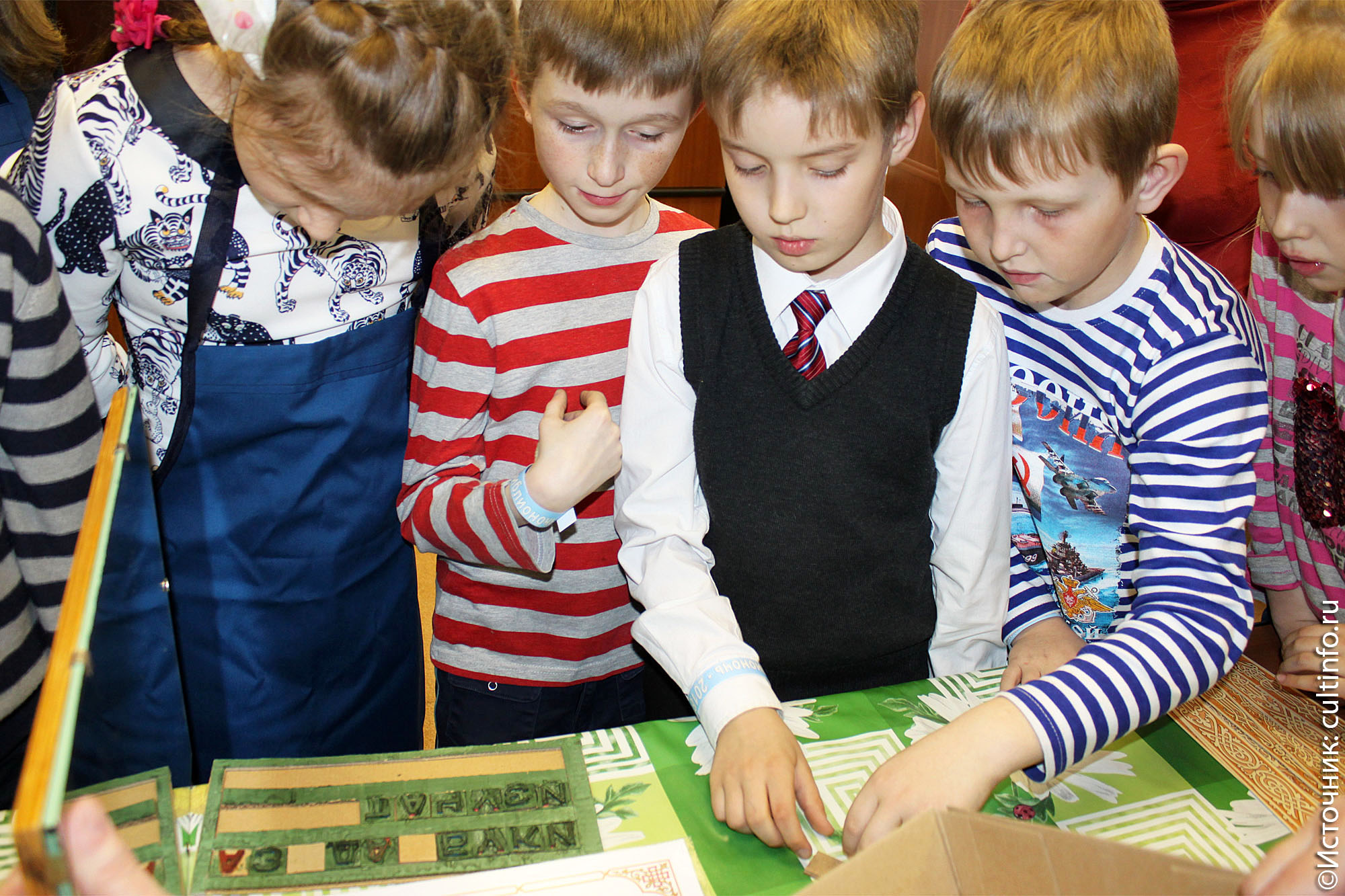 В Вологодской областной детской библиотеке традиционная игра – путешествие по станциям в этот раз познакомила детей с историей возникновения книги. Юные читатели – а среди них на этот раз были малыши 5-6 лет – побывали в разных странах и разных эпохах. В Древнем Египте изучали письмо иероглифами (по-научному оно называется лого-консонантное – это когда рисунки-иероглифы сочетаются со знаками, изображающими согласные звуки), попробовали расшифровать написанный таким образом короткий текст. В поисках волшебного свитка отправились в опасное путешествие по темному библиотечному залу, где в лучших традициях фантастических фильмов встретились с ожившей мумией. Древняя Индия приветствовала гостей таинственными мелодиями и подарила рассказ о древних книгах потхи: их узкие длинные страницы делали из пальмовых листьев, плотные обложки из дерева или кожи скрепляли с ними с одного края – в развернутом виде книга напоминала веер. В Древнем Междуречье дети познакомились с шумерской клинописью, а в Древнем Китае узнали об изобретении бумаги и книгах из узких бамбуковых пластинок. На Московском печатном дворе ребят встретил сам первопечатник Иван Федоров, который вместе с подмастерьем рассказал о том, как на Руси набирались и печатались первые книги. Везде юных посетителей встречали колоритные персонажи, в которых на вечер очень удачно перевоплотились библиотекари. И везде дети попробовали сделать что-то своими руками.